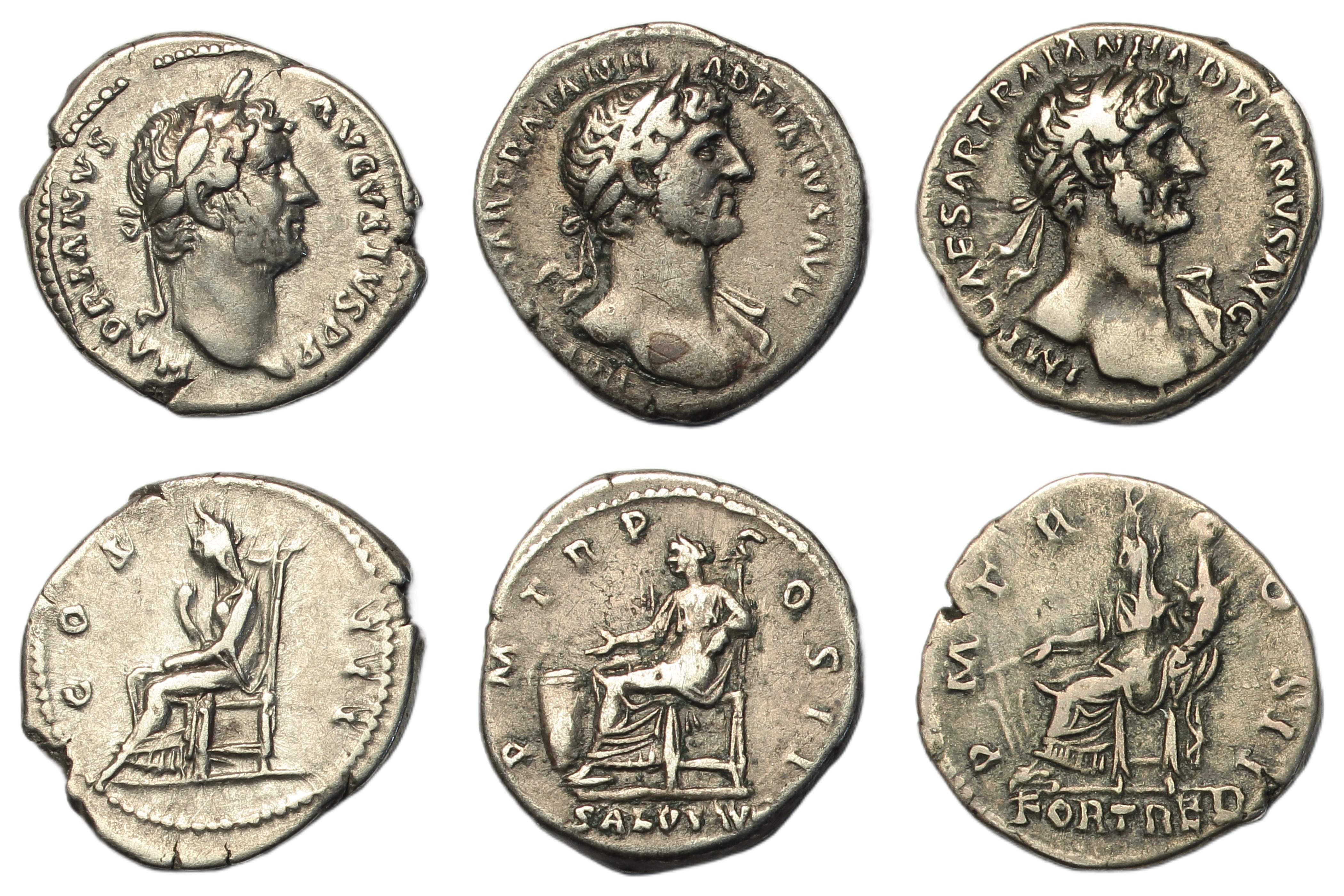 Denarii, Rome, laureate head right, rev. Pudicitia seated left on throne, (RSC 395a, RIC II 343); Rome, laureate head right, slight drapery, rev. Fortuna seated left, holding rudder on globe and cornucopia, (RSC 745, RIC 114); Rome, laureate bust, slight drapery, rev. Salus seated left, feeding snake coiled round altar, (RSC 1350, RIC 138). Good fine to very fine or better