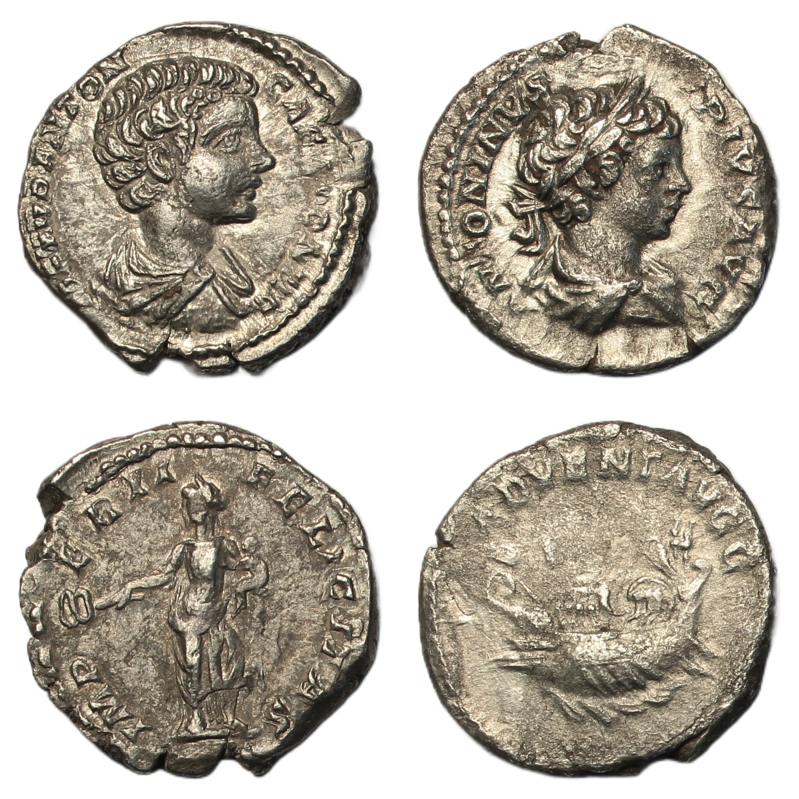 Denarii, Rome, bareheaded and draped bust right, rev. Felicitas (Felicity) standing left, holding a caduceus, and carrying a child on her left arm, (RSC 95, RIC 9); Rome, laureate and draped bust right, rev. galley with four oarsmen and a standing figure to left above waves, 3 figures seated under arch, vexillum at prow, (RSC 3, RIC 120). Good very fine, the reverse of the second weakly struck