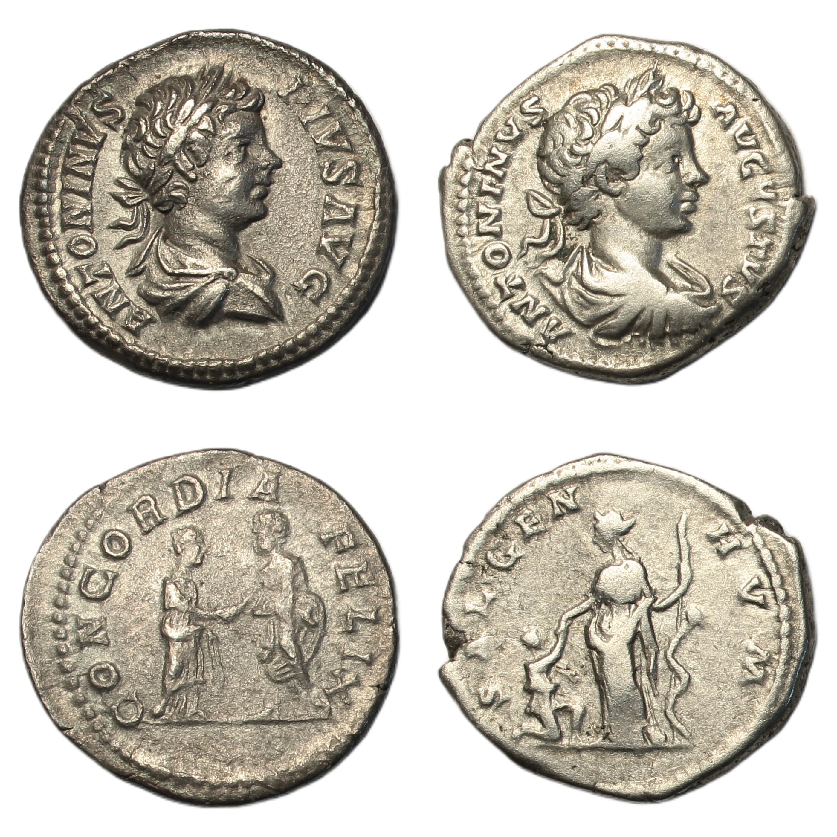 Denarii, Rome, laureate and draped bust right, rev. Plautilla and Caracalla standing facing each other and clasping hands, (RSC 23, RIC 124a); Rome, laureate and draped bust right, rev. Salus standing, extending right hand to man kneeling before her and holding serpent-entwined sceptre, (RSC 558, RIC 42c). The first attractive, nearly extremely fine, the second, nearly very fine