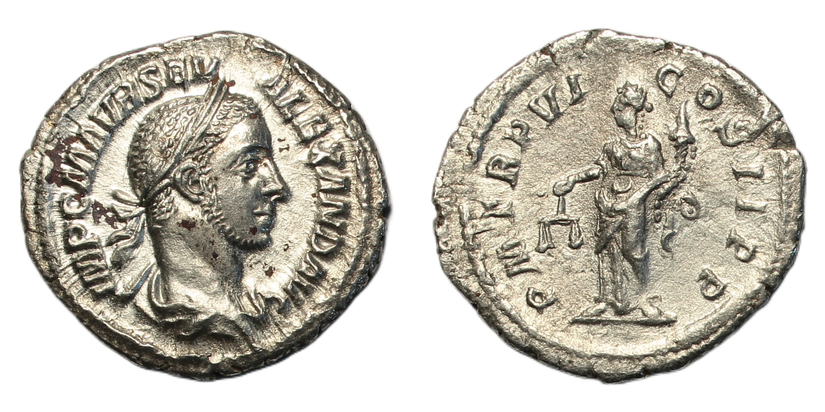 Denarius, Rome, 7th emission, laureate and draped bust right, rev. Aequitas standing left, holding scales and cornucopia, 2.36g, (RSC 312, RIC IV 64). Extremely fine