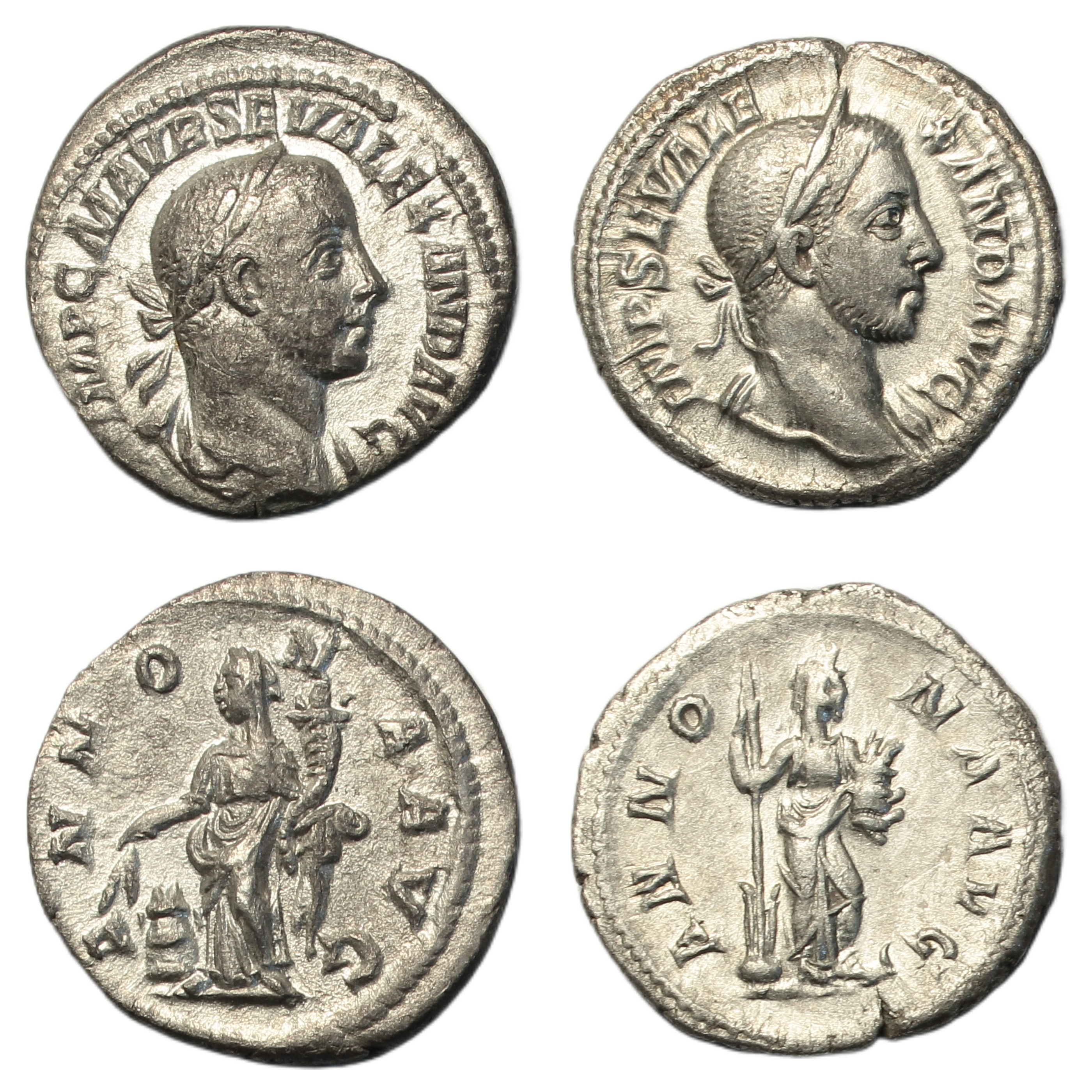 Denarii, Rome, laureate and draped bust right, rev. Annona standing holding grain ears over modius and cornucopiae, (RSC 23, RIC 133); Rome, laureate head right, rev. Annona standing holding rudder and modius with corn ears, (RSC 32 var. (without drapery), RIC 190). Good very fine