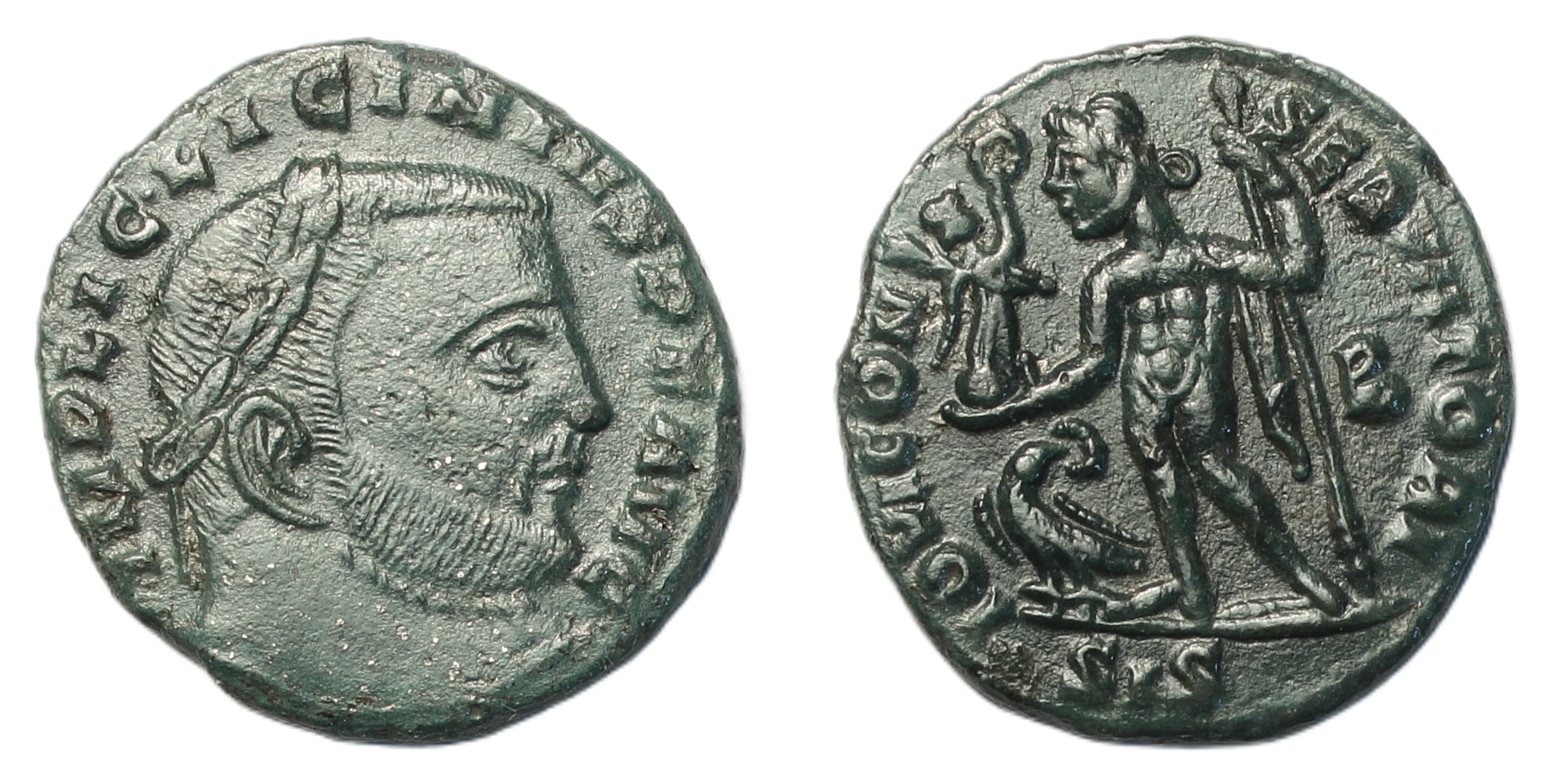 Bullion Nummus, Siscia, laureate head right, rev. Jupiter standing left, holding sceptre and Victory on globe, eagle with wreath in beak at feet, B in right field, SIS in exergue, 3.21g, (RIC VII-8). Deep rich chocolate toning, extremely fine