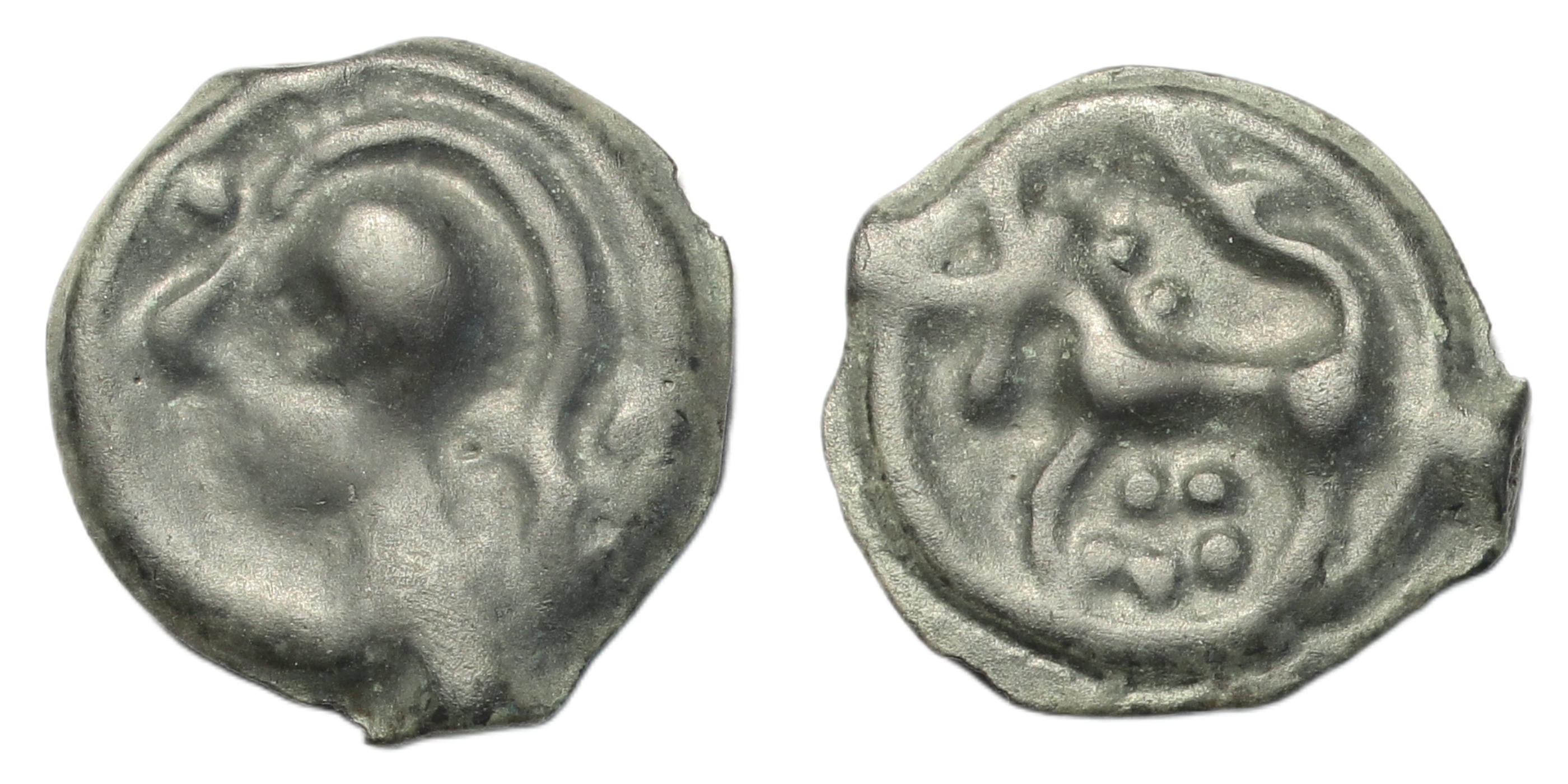 Potin, styalised helmeted head left, rev. horse with bifid tail left, rosette of five globules below, 3.36g, (LT. 7388-7392, DT. 150, CCCBM 1. 379-381). Extremely fine