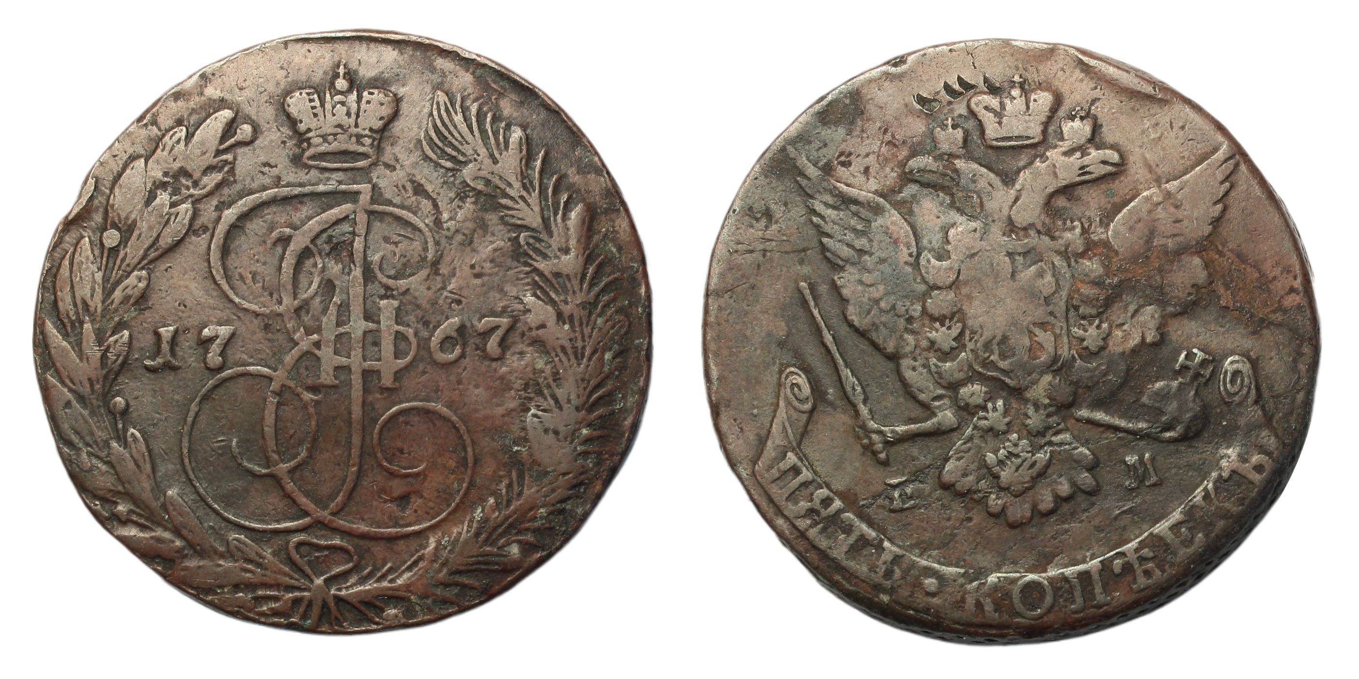 5 Kopeks, 1767, Ekaterinburg, monogram between date, rev. EM split between crowned double-headed eagle, (Brekke 246). Toned, about very fine