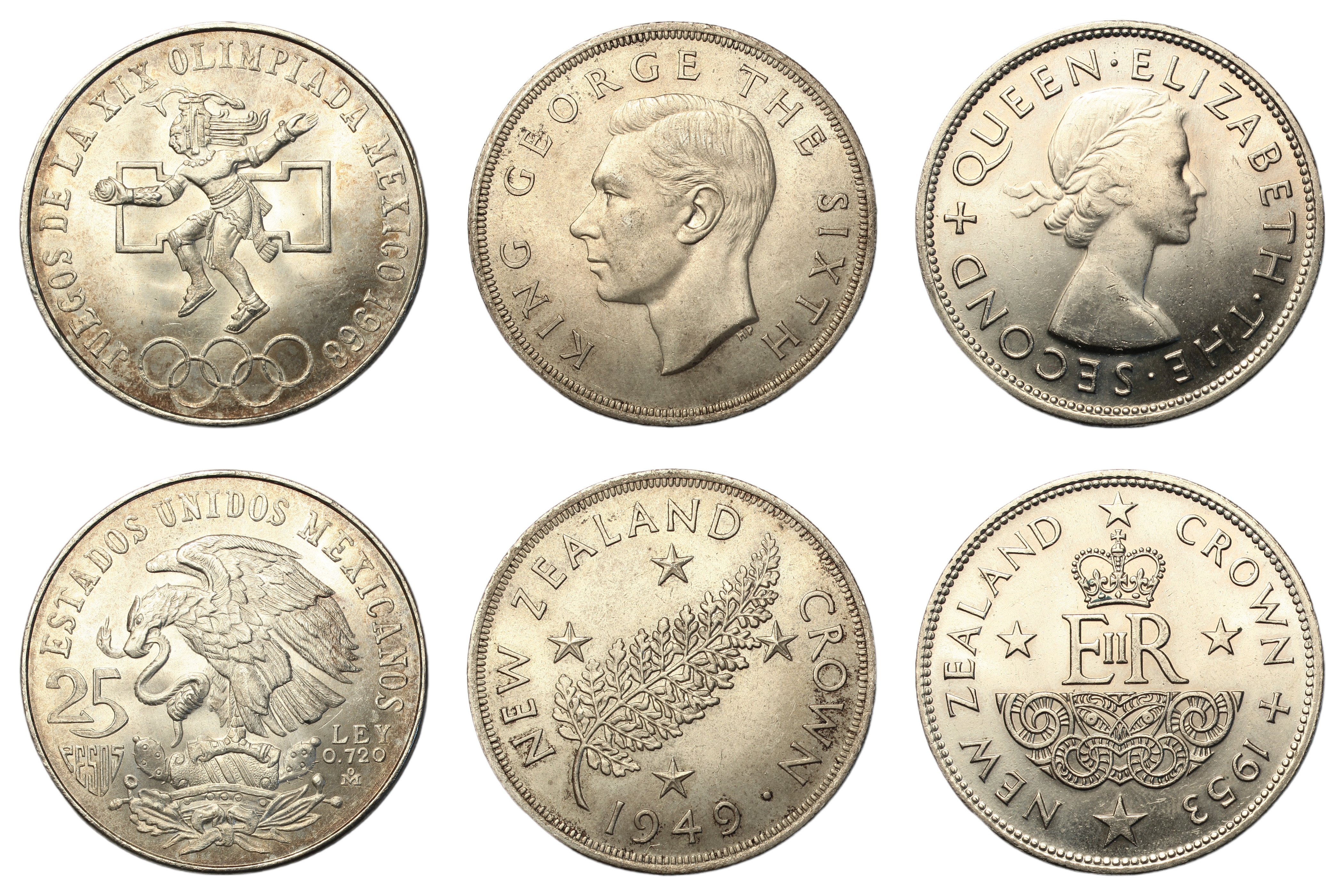 New zealand (2), 1949 (0.500 silver) and 1953 (CuNi); together with a Mexico 25 Pesos (0.720 silver). All brilliant uncirculated