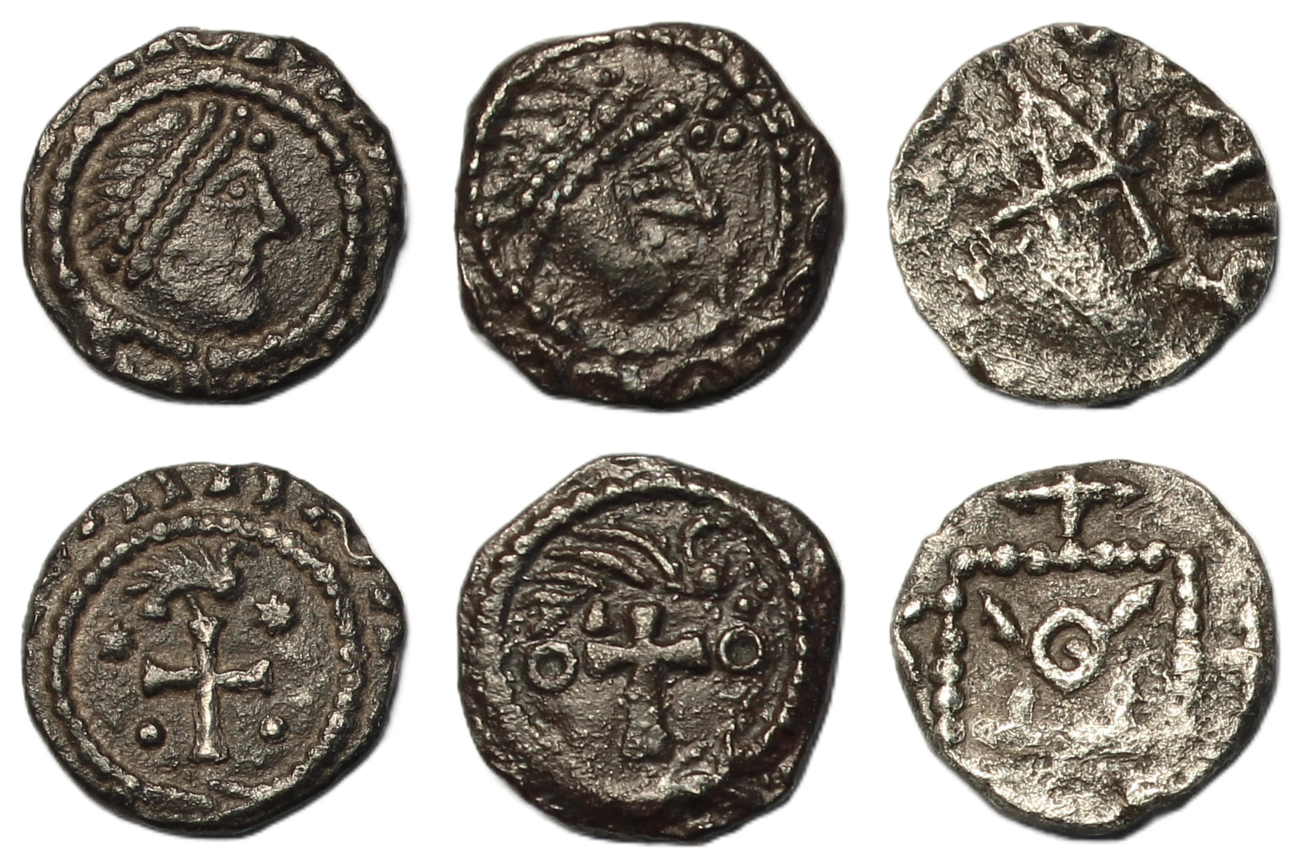 Primary phase, series BI, diademed head right within serpent circle, rev. bird right on cross; Series BIIIA, diademed head right within serpent circle, rev. bird right on cross, annulets either side; Series R?, diademed head right, legend before, rev. standard, (SCBC. 777, 777A, 813A?). Generally porous metal, fine to nearly very fine