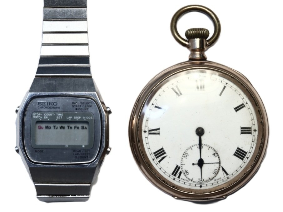 Vintage watches (2), base metal Hunter, missing minuet hand, balance wheel seems to be working well. Seiko 1970/80s Chronograph with stainless steel braclet, unable to confirm if this watch is in working order