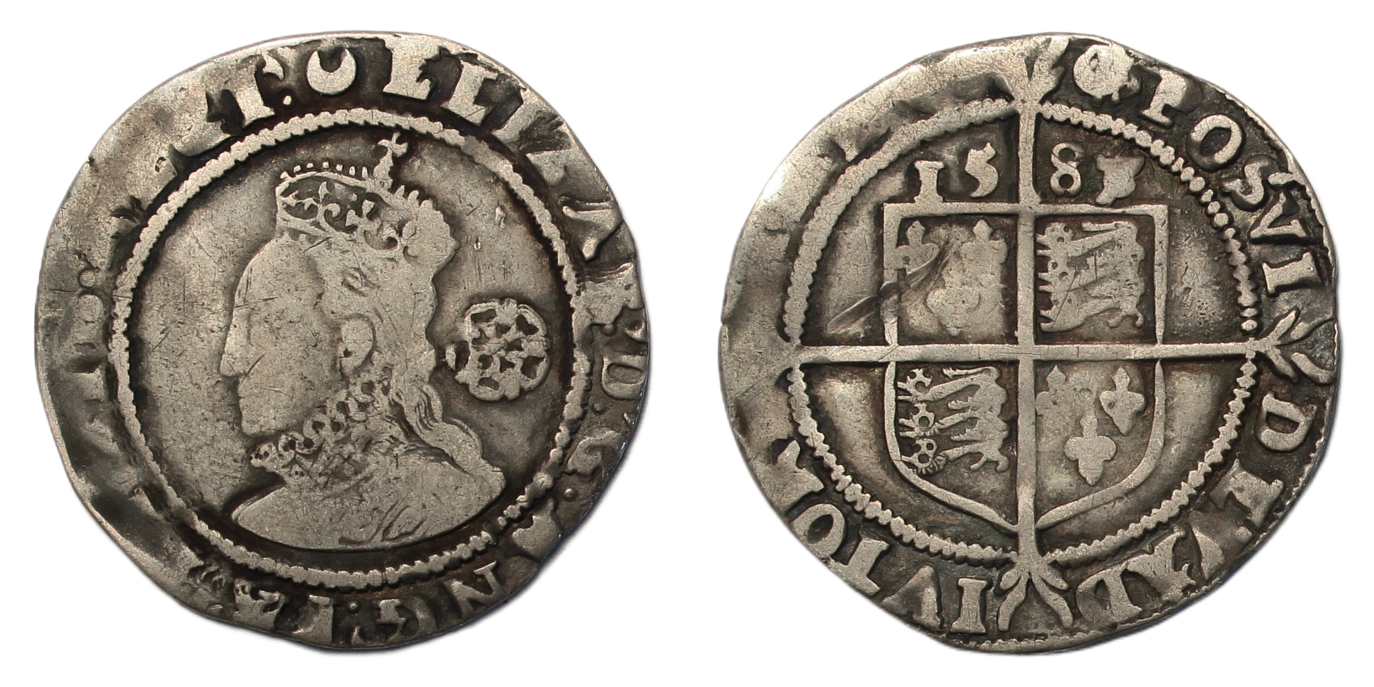 Sixpence, 1587 over 6, sixth issue, bust 6B, crowned bust left rose behind, rev. long cross fourchée over shield, date above, mm. crescent/crescent over escallop, 2.84g, (SCBC 2578A, N.2015). Fine, overdate clear