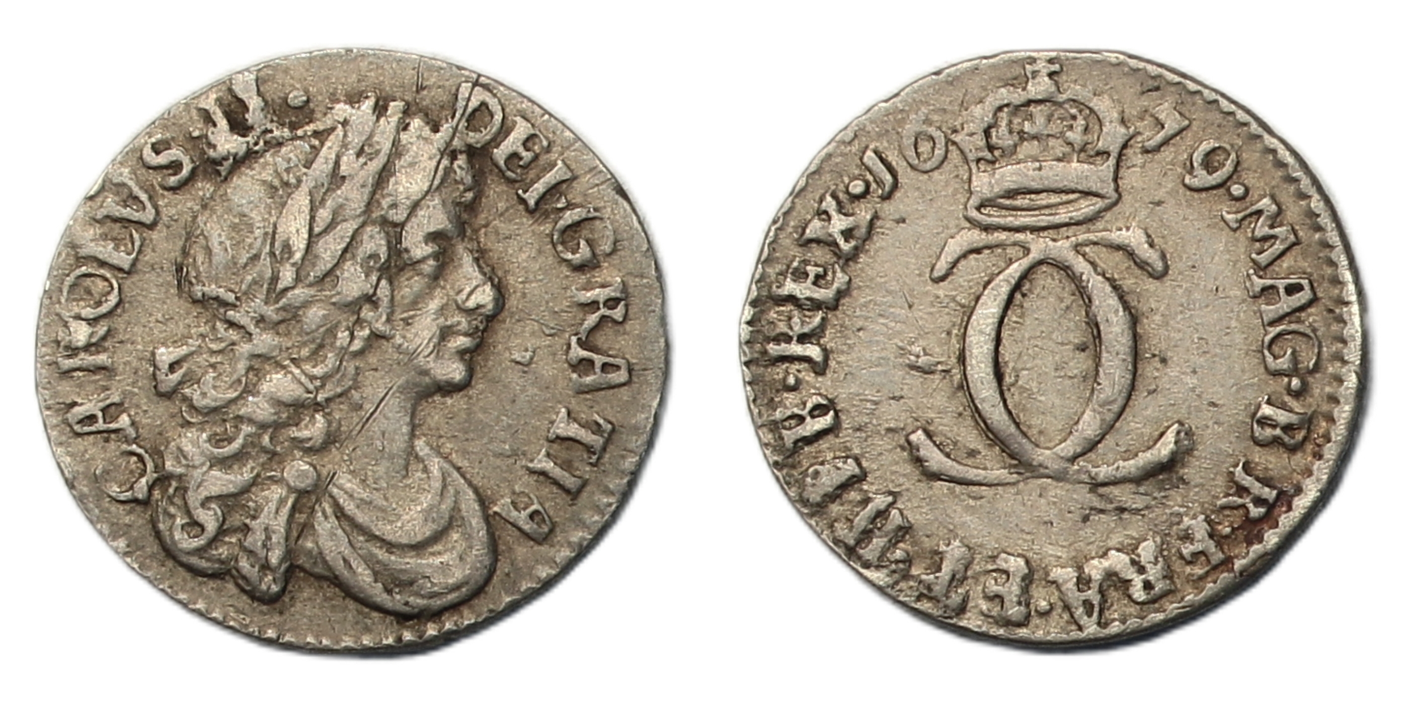 Twopence, 1679, HIB over FRA, laureate and draped bust right, rev. crowned pair of linked C's, (SCBC 3388, ESC 2181A, Bull 692). Some scratches to obverse, very fine