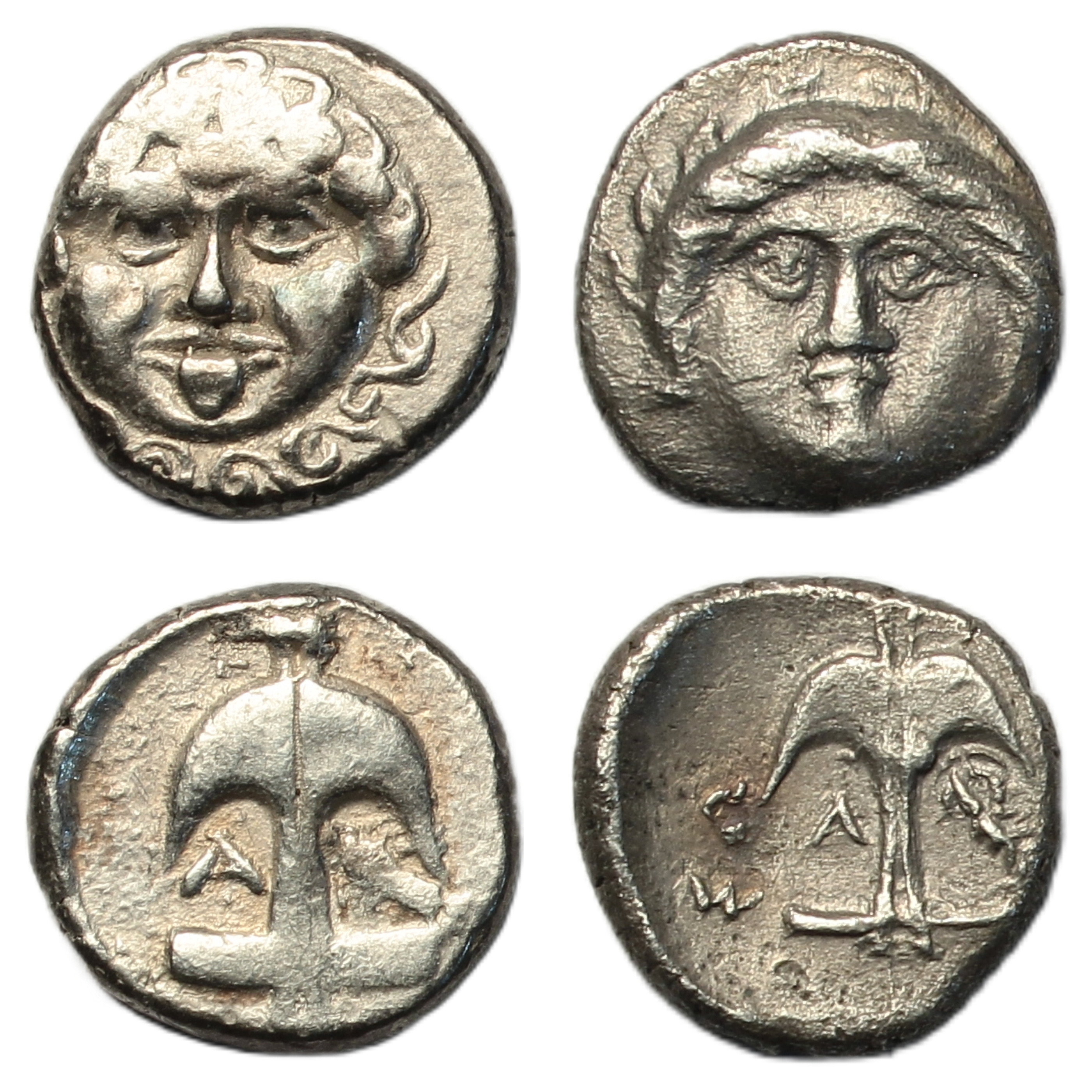 Drachm, gorgoneion facing, rev. anchor, crayfish to right, A to left, (SNG Copenhagen 456-457); Diobel, laureate neckless head of Apollo facing, rev. anchor, crayfish to right, A to left, (BMC 15). Both very fine