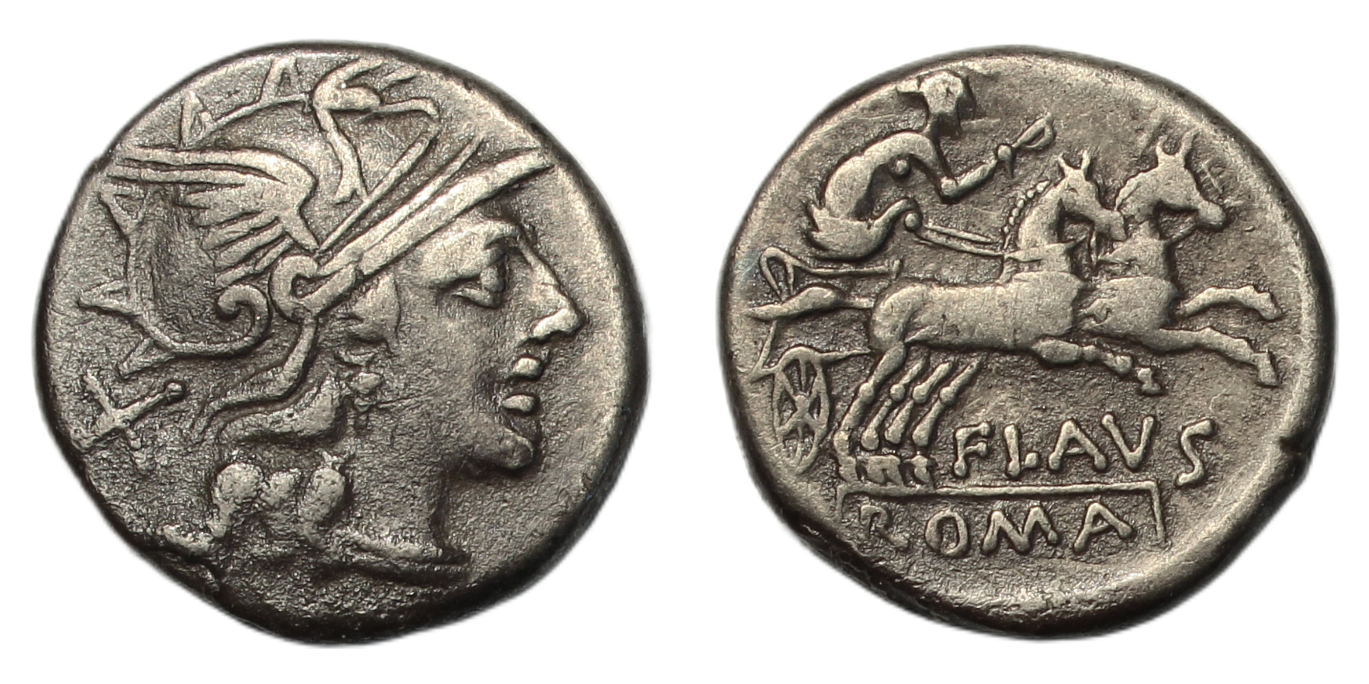 Denarius, head of Roma right, mark of value behind, rev. Diana in biga right, FLAVS below, ROMA in exergue, 3.78g, (Crawford 207/1). About very fine