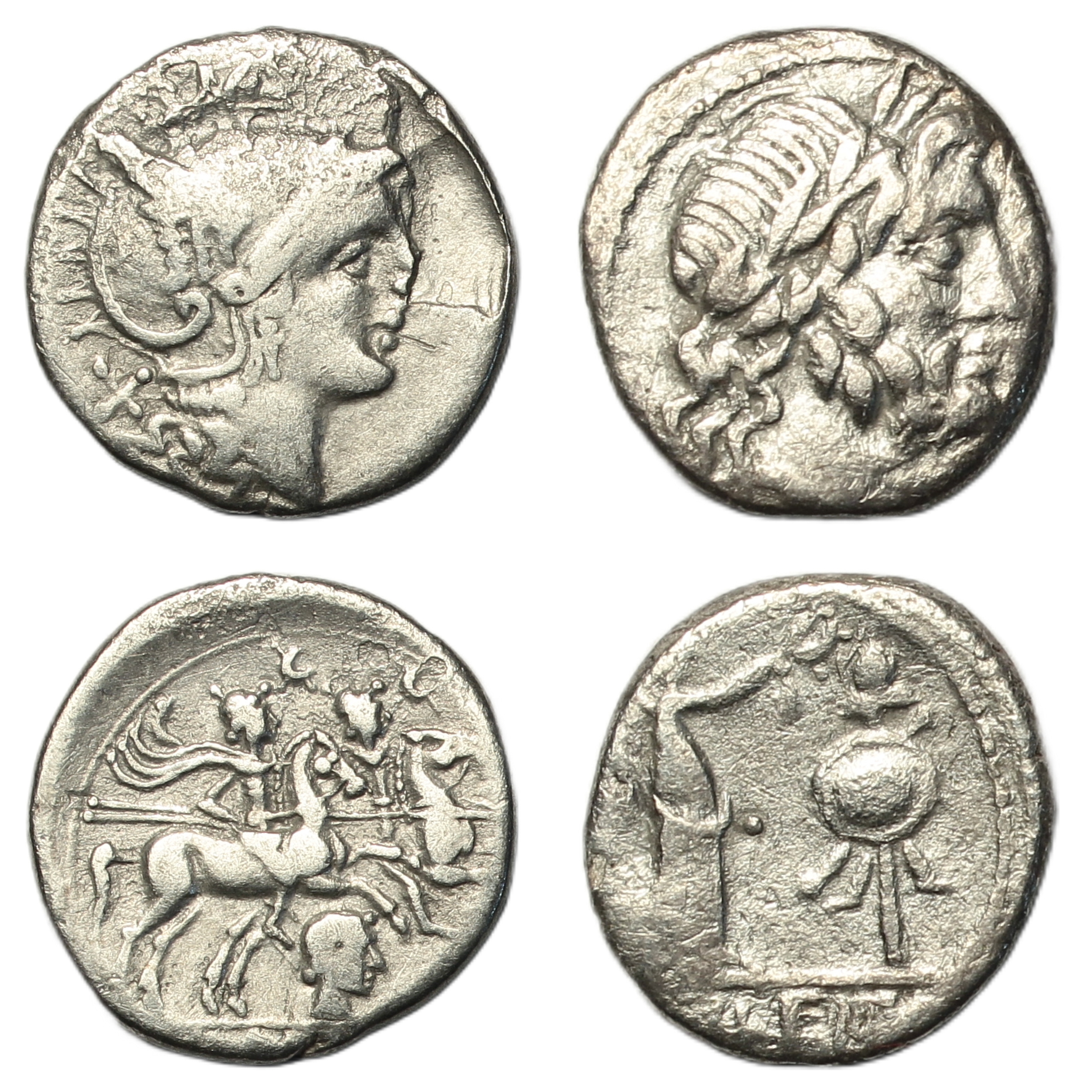 Denarius, Horatius (206-200 BC), head of Roma right, rev. the Dioscuri on horseback right, female head below, (Crawford 127/1); Quinarius, Rome mint, head of Jupiter right, rev. Victory standing to right, CN. LENT in exergue, (Crawford 345/2). Good fine or better