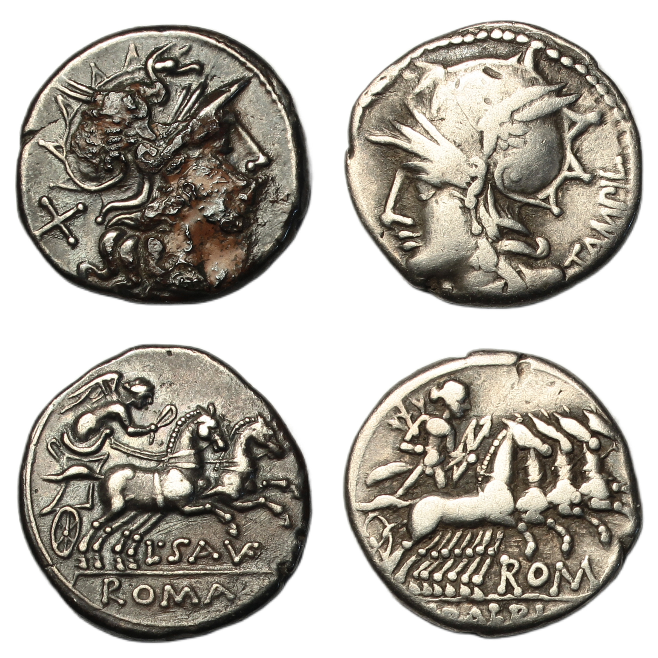 L. Saufeius (152 BC), Rome mint, head of Roma right, mark of value to left, rev. Victory, driving galloping biga right, (Crawford 204/1); M. Baebius Q.f. Tampilus (137 BC), Rome mint, head of Roma left, mark of value below chin, rev. Apollo driving galloping quadriga right, (Crawford 236/1c). The first extremely fine but with some surface deposit on obverse, the second good fine or better
