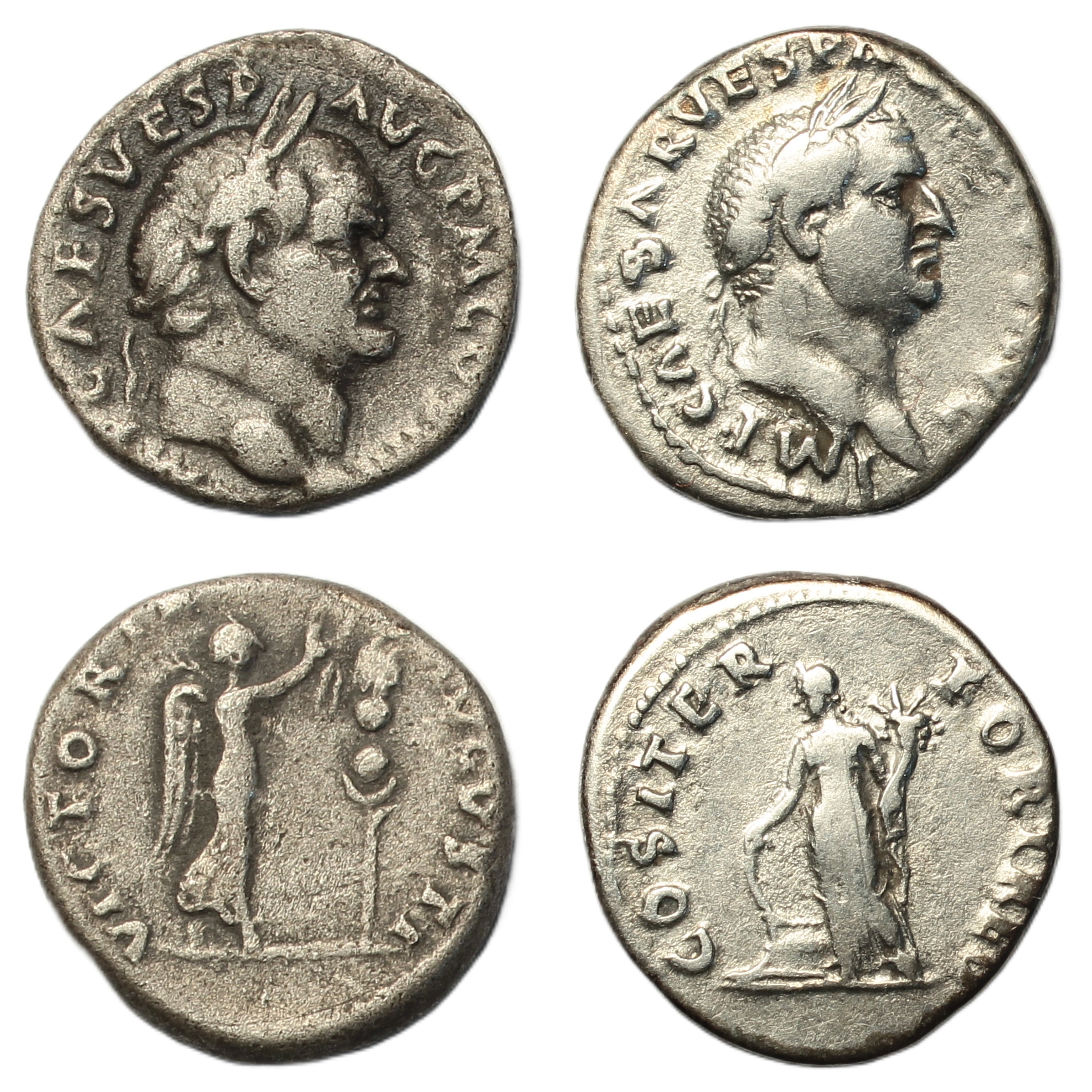 Denarii, "Judaea Capta" commemorative, Rome, laureate head right, rev. Victory advancing right, holding palm frond and placing wreath on signum to right, (RSC 618, RIC II.1 362); Rome, laureate head right, rev. Fortuna standing left, hand on prow and holding cornucopia, (RSC 84, RIC II.1 19). Good fine