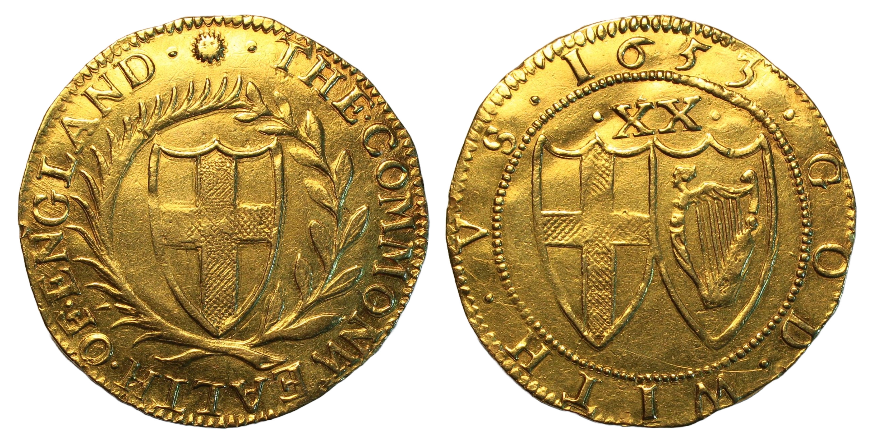 Unite, 1653, English shield within laurel and palm branches, rev. English and Irish shields, mark of value and date above, mm. sun, 8.99g, (SCBC 3208, N.2715). Sometime cleaned, otherwise round with a decent strike, good very fine