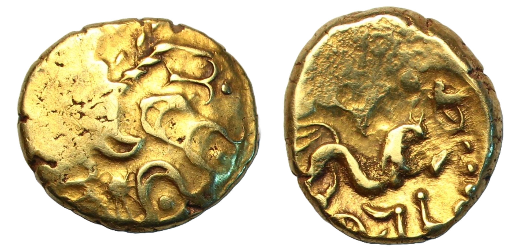 Stater, Selsey two-faced, wreath design with two hidden faces, rev. triple-tailed horse right, wheel below, charioteer's arm above, 6.04g, (SCBC 38, ABC 485). Area of weakness across one side otherwise very fine