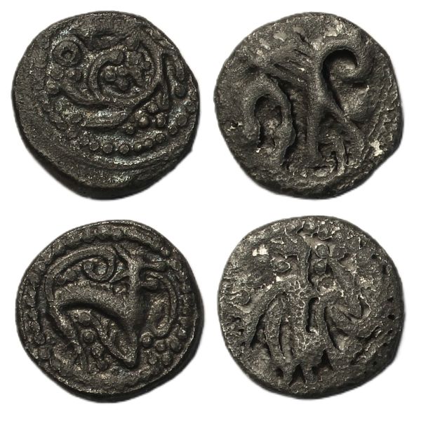 Sceats, secondary phase, Series M, sinuous animal right looking up, curled tail above, claws below, pellets surround, rev. vine coiled anticlockwise from centre to edge, (SCBC 805, Abramson 61-30); Eclectic sceattas, 'fledgling type', crude style, wolf head right, prominent mane, serpent below, rev. running fledgling, (SCBC 832, Abramsam 44-30). The first very fine the second crude but fine and excessively rare