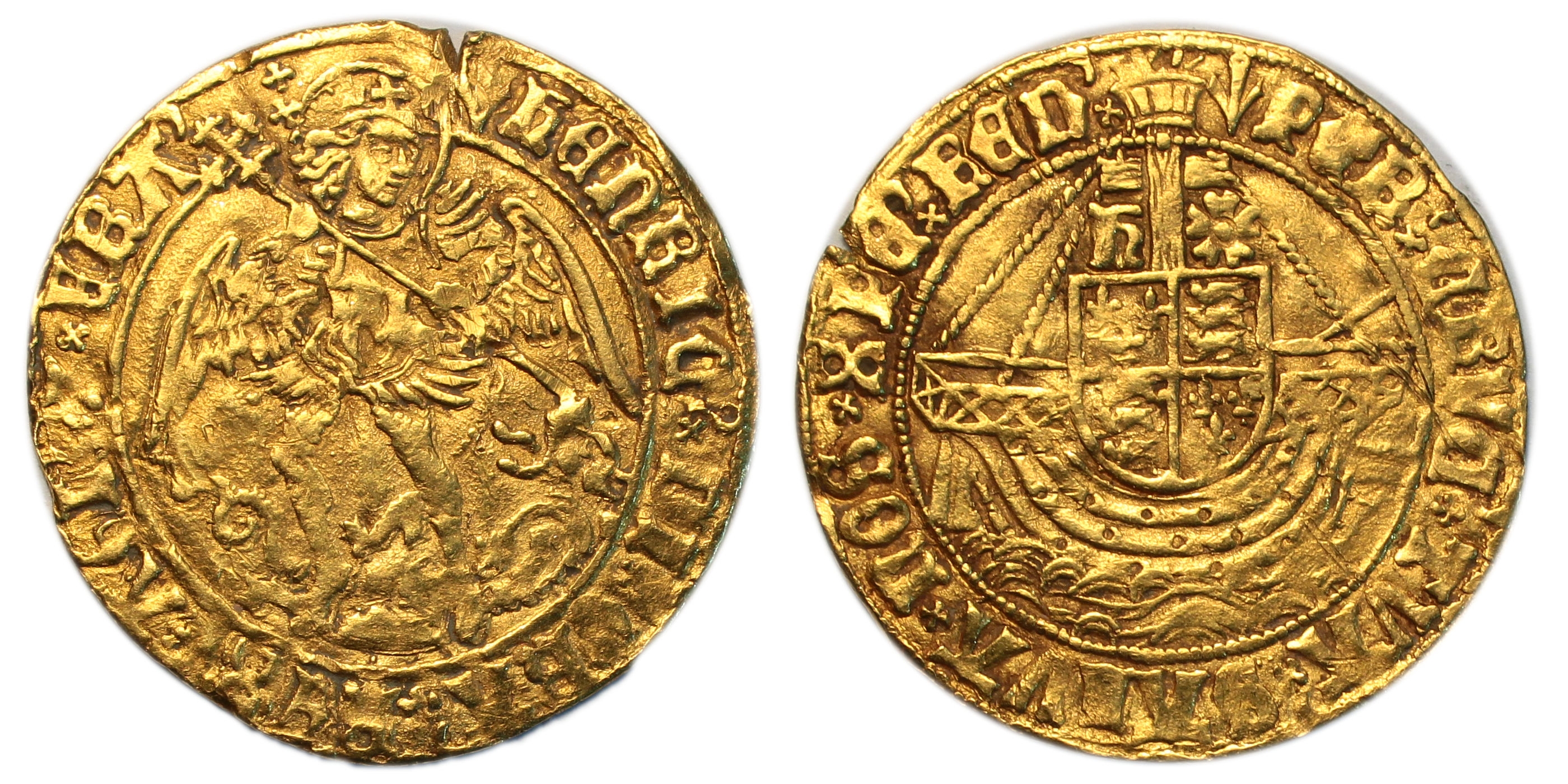 Angel, type V, St. Michael spearing the dragon, rev. ship with H and rose beside mast, mm. pheon, 4.95g, (SCBC 2186, N.1697). Small edge split and a couple of scratches on the reverse, otherwise very fine