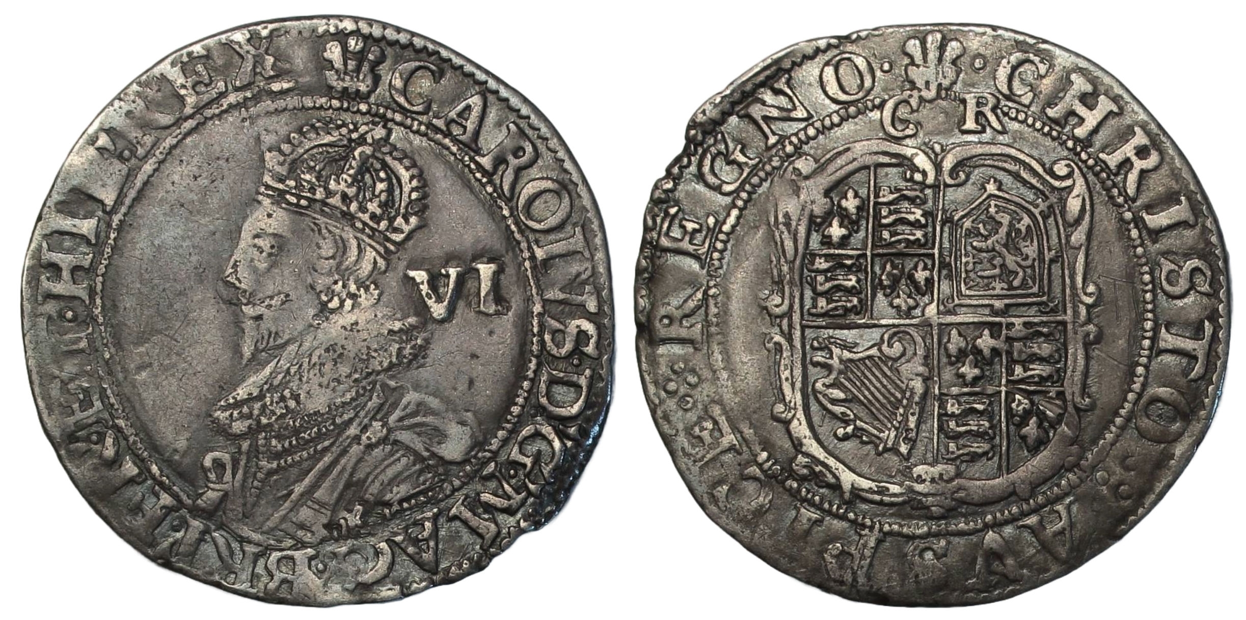 Sixpence, Tower mint, group C, crowned bust left wearing ruff, mark of value behind, rev. shield, C R above, two cruciform stops in legend, mm. plume, 2.86g, (SCBC 2809, N. 2238, Brooker 594, same obv. die). F 7 faintly scratched on reverse, otherwise very fine