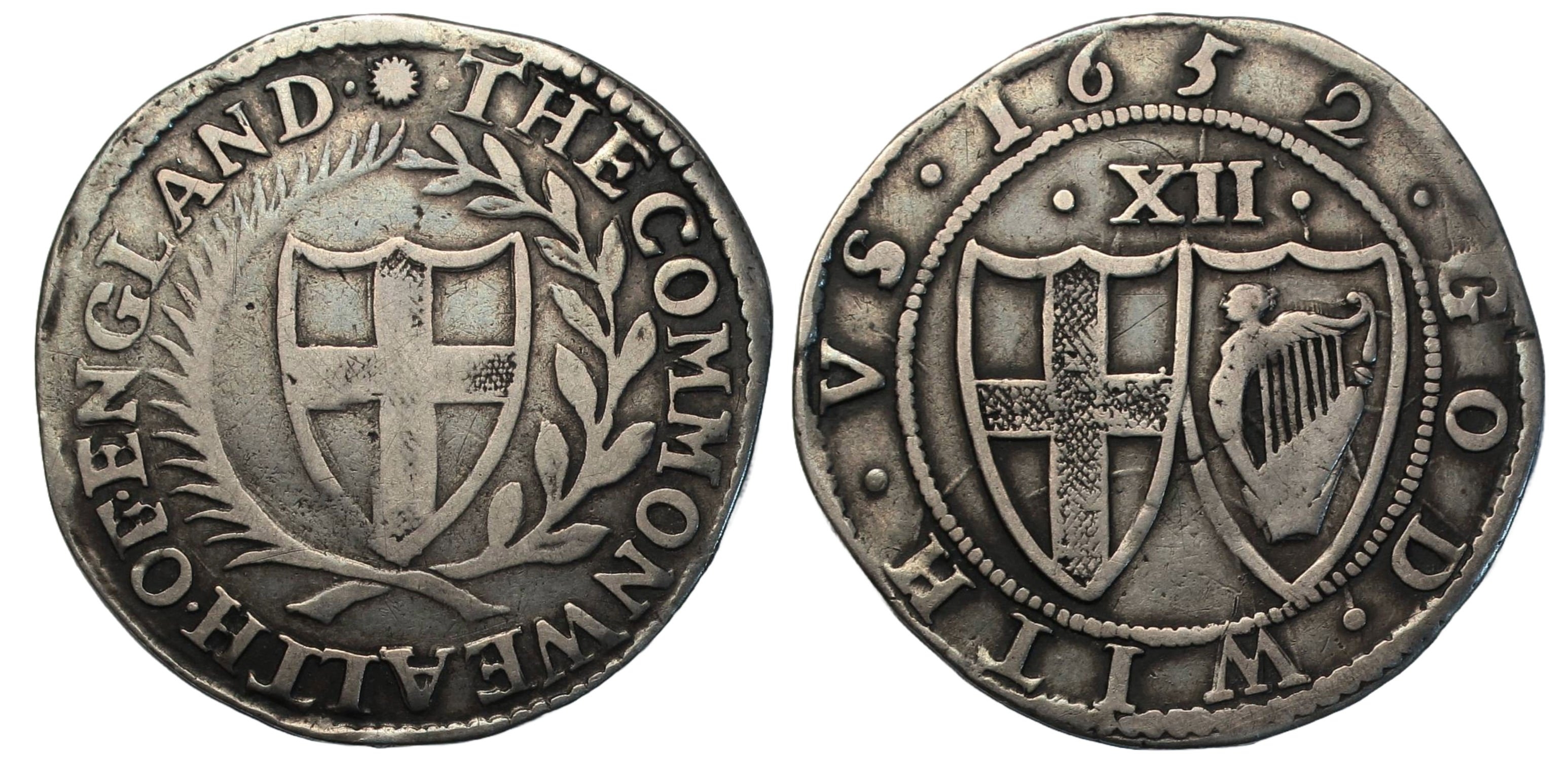Shilling, 1652, English shield within laurel and palm branches, rev. English and Irish shields, mark of value and date above, mm. sun, 5.72g, (SCBC 3217, N.2724). Struck on a well spread flan, toned and nearly very fine