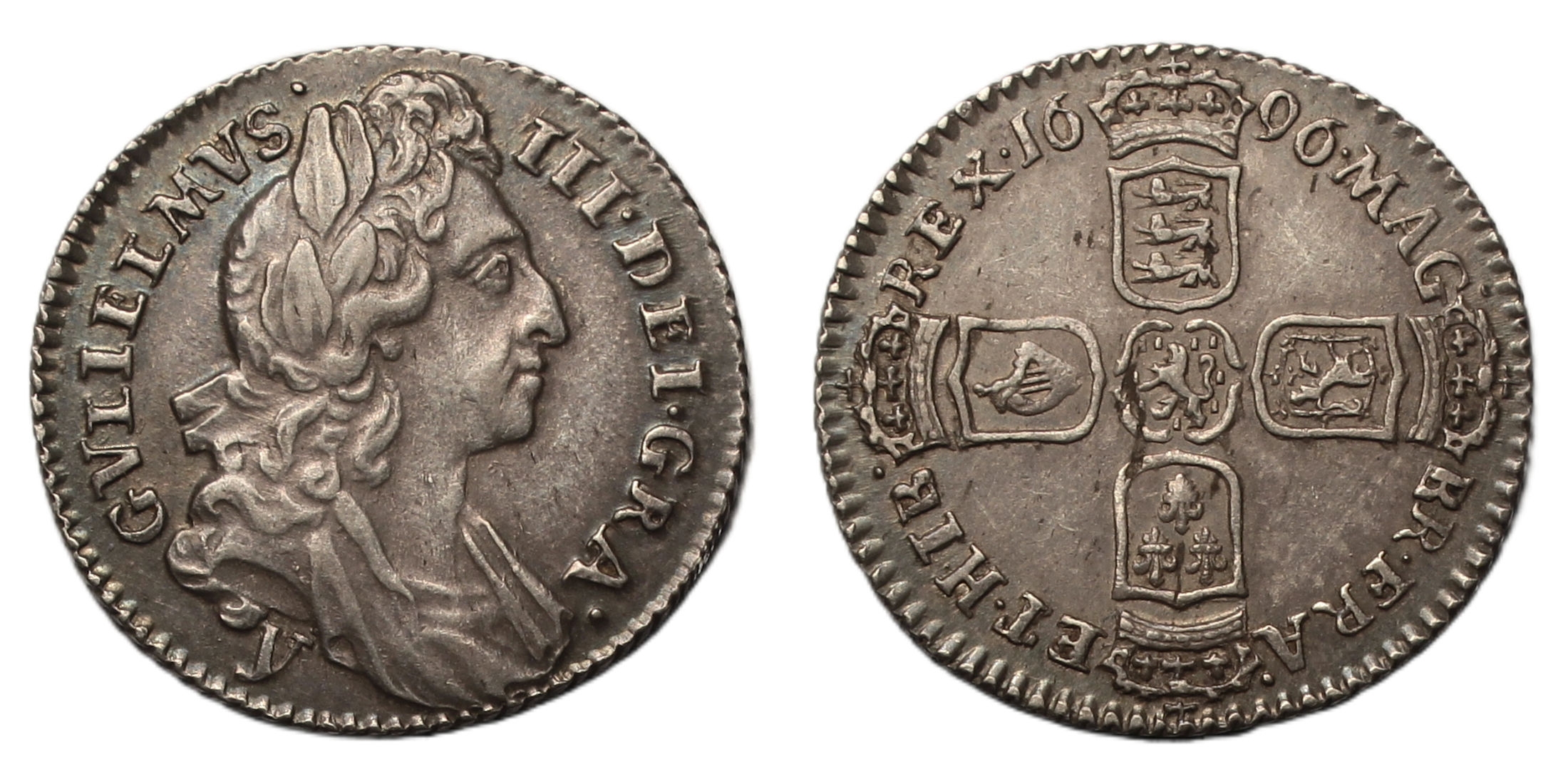 Sixpence, 1696, York, first laureate bust right, y below, rev. crowned cruciform shields, angles plain, (SCBC 3525, ESC 1296). Nicely toned, nearly extremely fine