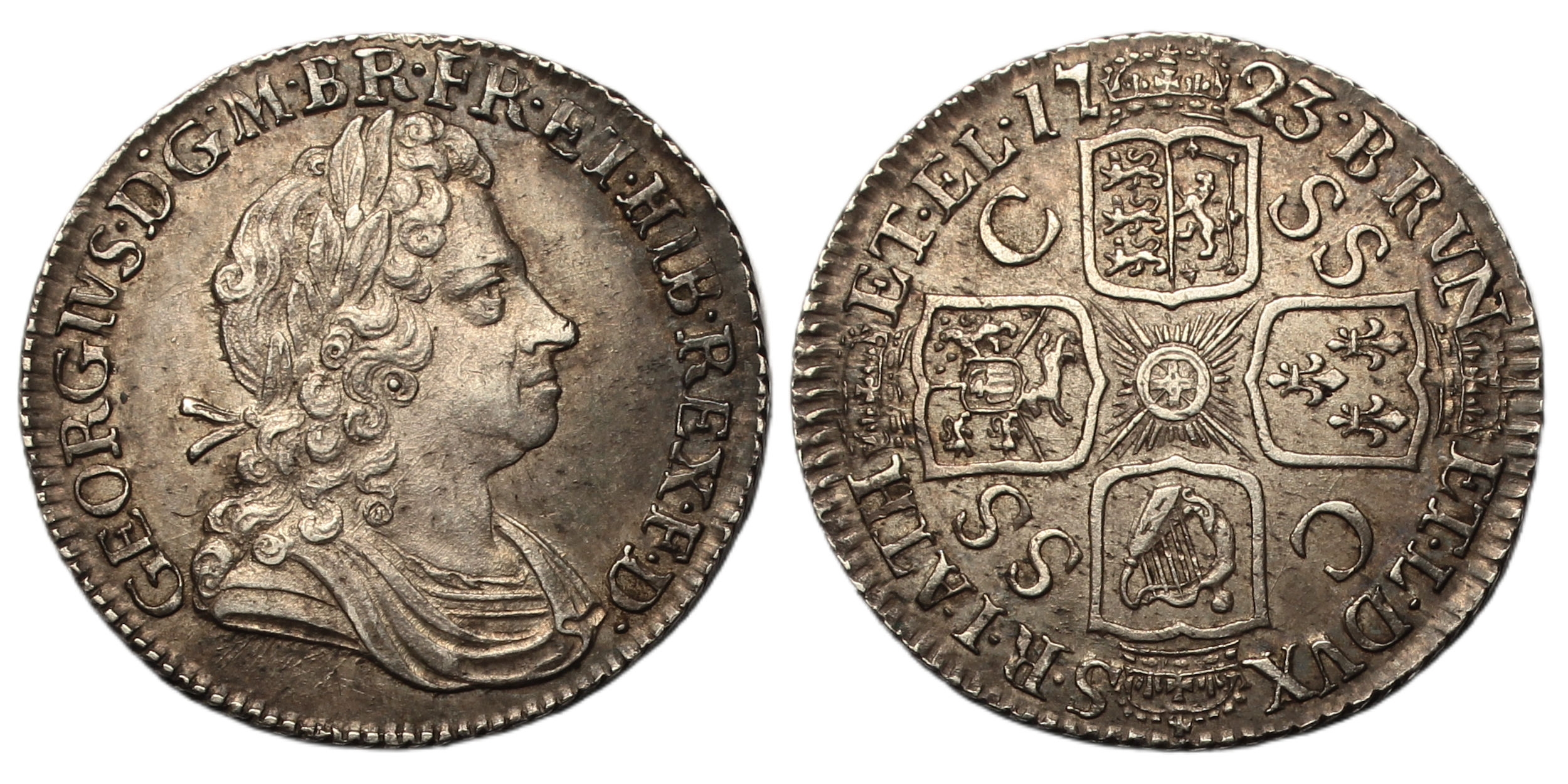 Shilling, 1723, first laureate bust right, rev. crowned cruciform shields, SS C in angles, (SCBC 3647, ESC 1586). Toned, good extremely fine