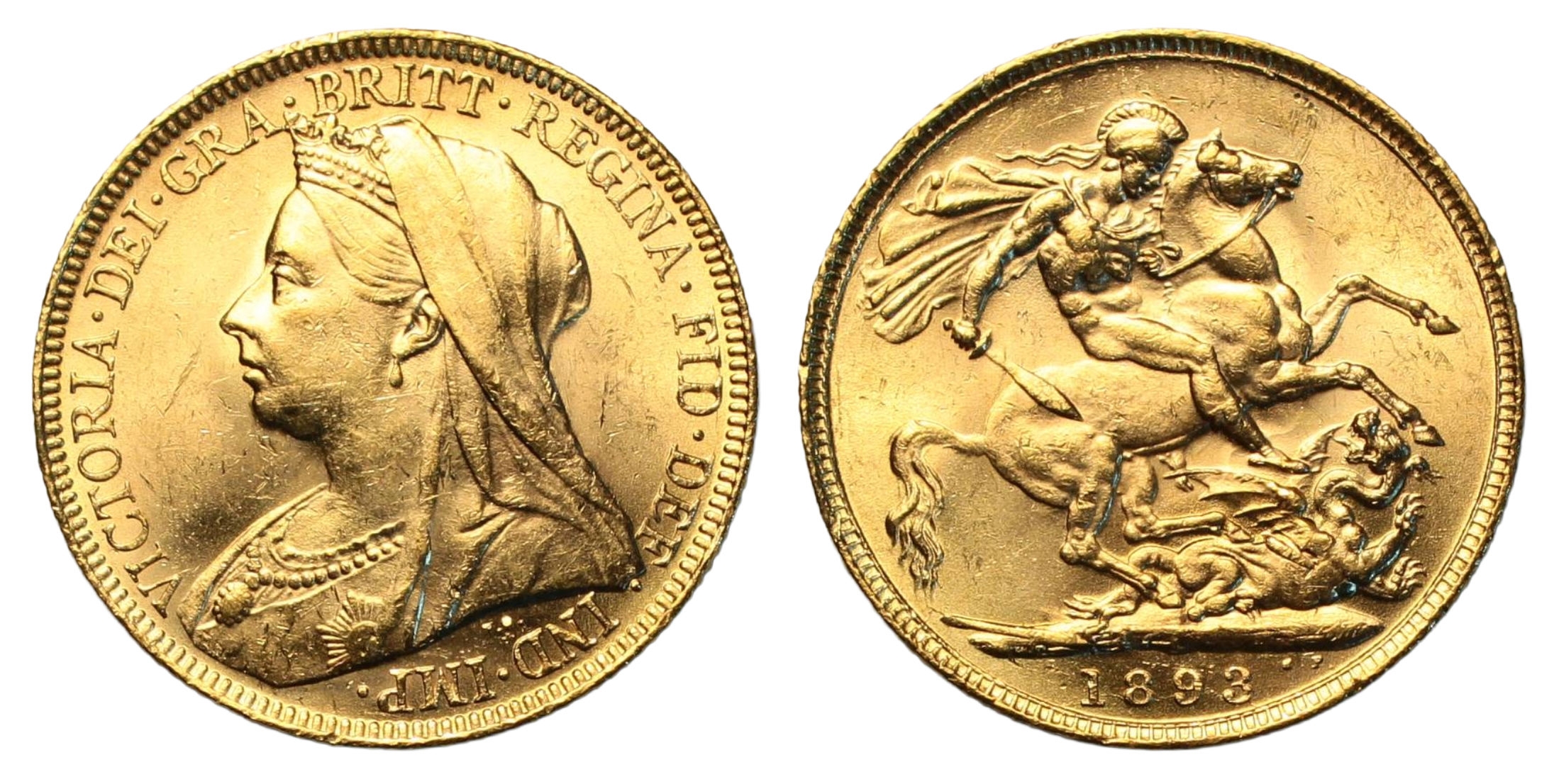 Sovereign, 1893, old veiled bust left, rev. St. George slaying dragon, date below, (SCBC 3874, Marsh 145). About very fine