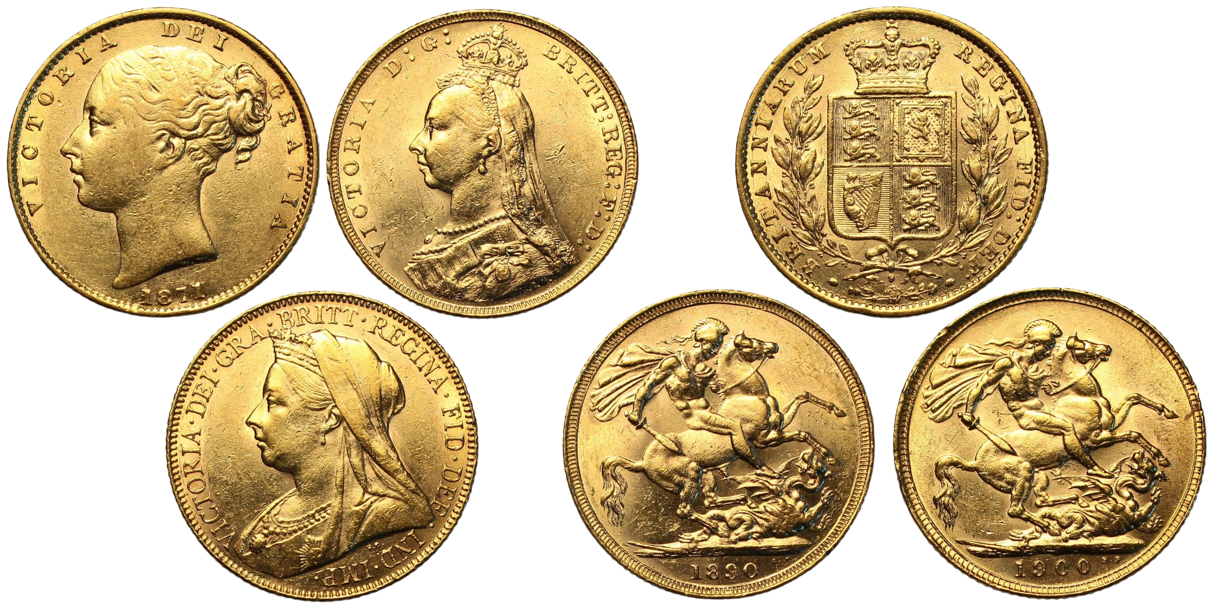 Sovereign set, 'the three faces of Victoria' comprising of 1871, young head shield back, die number 9 (SCBC 3853B); 1890, Jubilee bust (SCBC 3866B) and 1900, veiled bust (SCBC 3874). The 1871 about very fine, the other two very fine