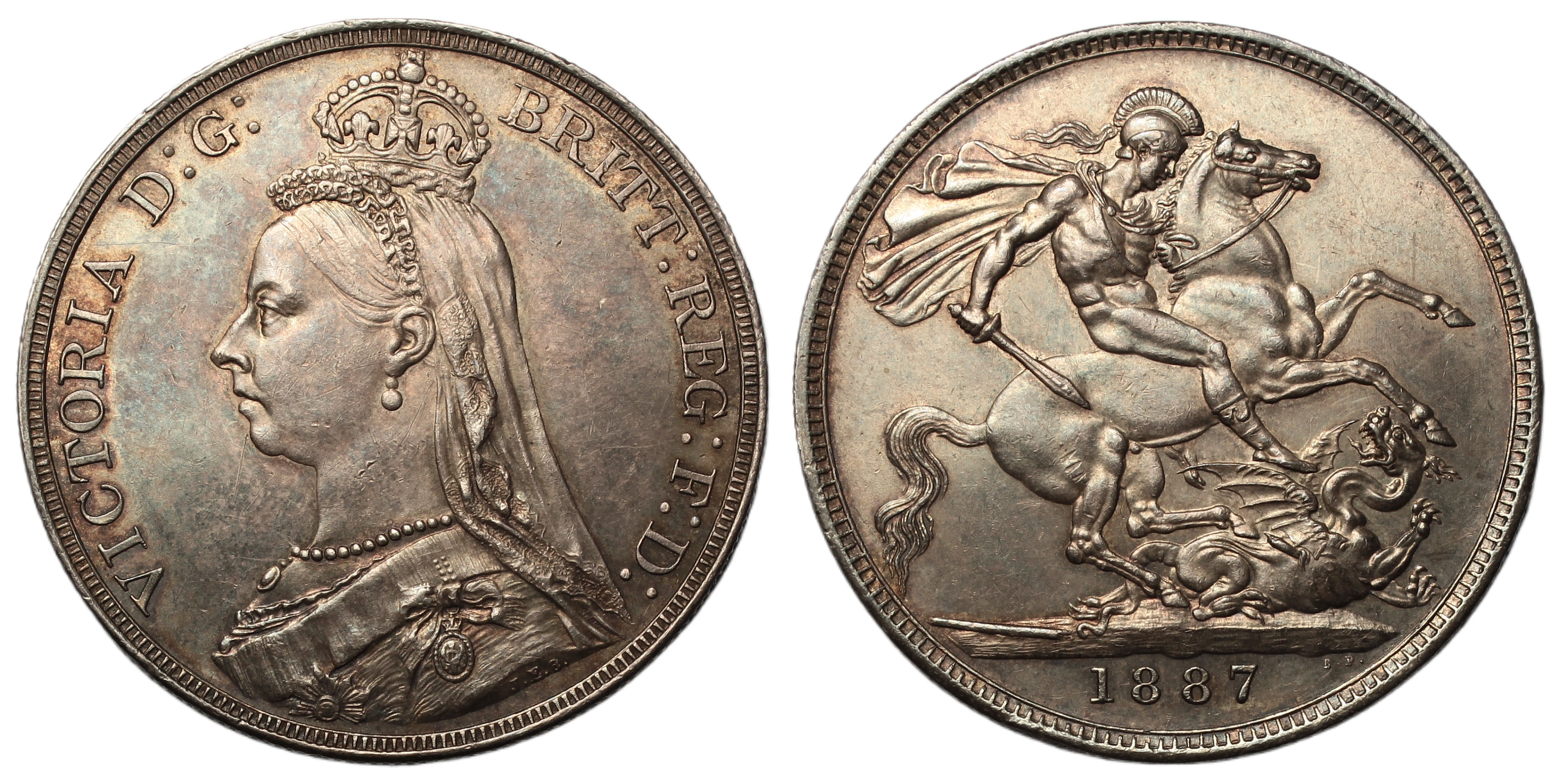 Crown, 1887, jubilee bust left, rev. St. George slaying dragon, date below, (SCBC 3921, ESC 2585). Delightfully toned with good surfaces, about uncirculated