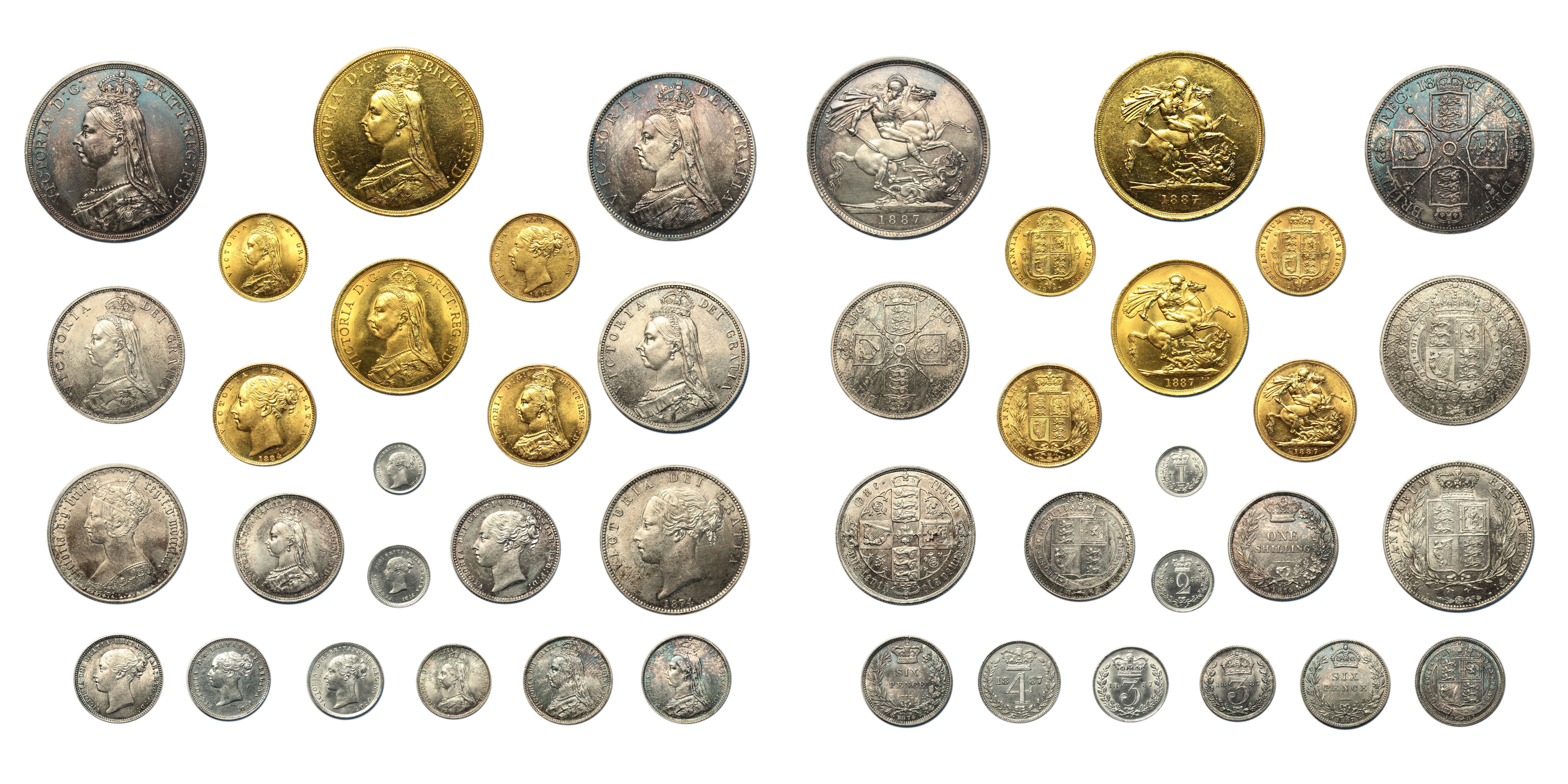 The set comprises: 1887 jubilee head five pounds, prooflike uncirculated, (SCBC 3864); 1887 jubilee head two pounds, about uncirculated, (SCBC 3865); 1887 jubilee head sovereign, Melbourne, extremely fine with a small test cut to the edge, (SCBC 3867A); 1887 jubilee head half sovereign, uncirculated, (SCBC 3869); 1884 young head sovereign, Melbourne, uncirculated, (SCBC 3854A); 1878 young head half sovereign, die number 21, extremely fine, (SCBC ); 1887 jubilee head silver, crown down to threepence including both sixpence designs, good extremely fine to uncircualted, (SCBC 3921, 3923, 3924, 3925, 3926, 3928, 3929 and 3931); 1874 young head half crown, uncirculated, (SCBC 3906A); 1874 young head sixpence, die 31, good extremely fine, (SCBC 3910); 1887 young head maundy set, about uncirculated but fourpence cleaned, (SCBC 3916)