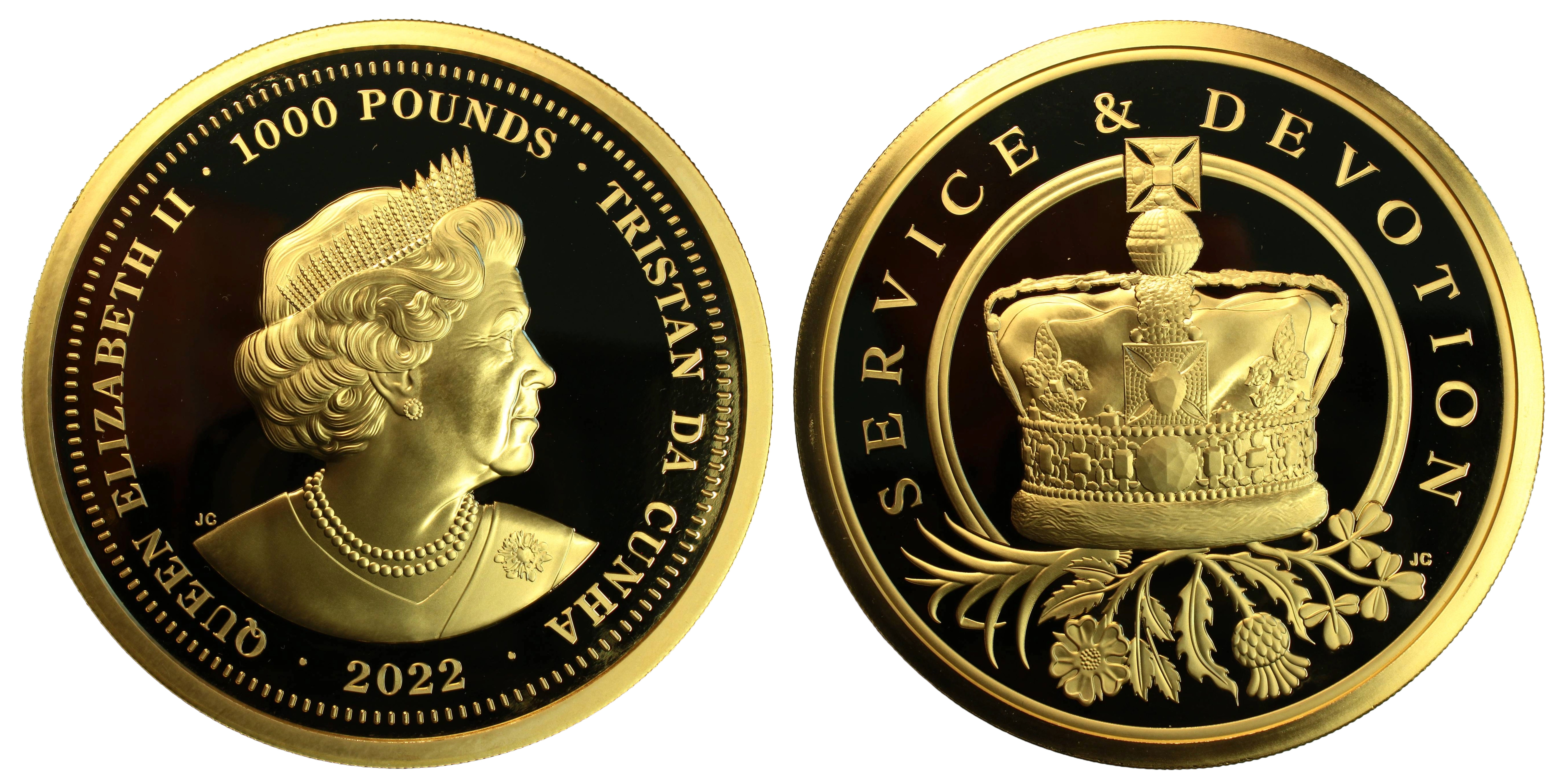 Proof One thousand pounds, 2022, 1kg of 22ct gold, 100mm, portrait right, wearing tiara and necklace, rev. Imperial State Crown resting upon a rose, thistle, leek and shamrock. FDC with Hattons of London box and certificate of authenticity, limited to only 9 coins