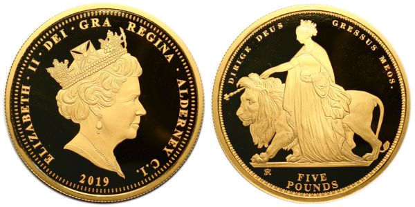 Proof £5, 2019, Queen Victoria 200th Anniversary by Hattons, crowned head right, date below, rev. the young Queen Victoria as Una, with the lion. As struck with certificate of authenticity in case of issue.