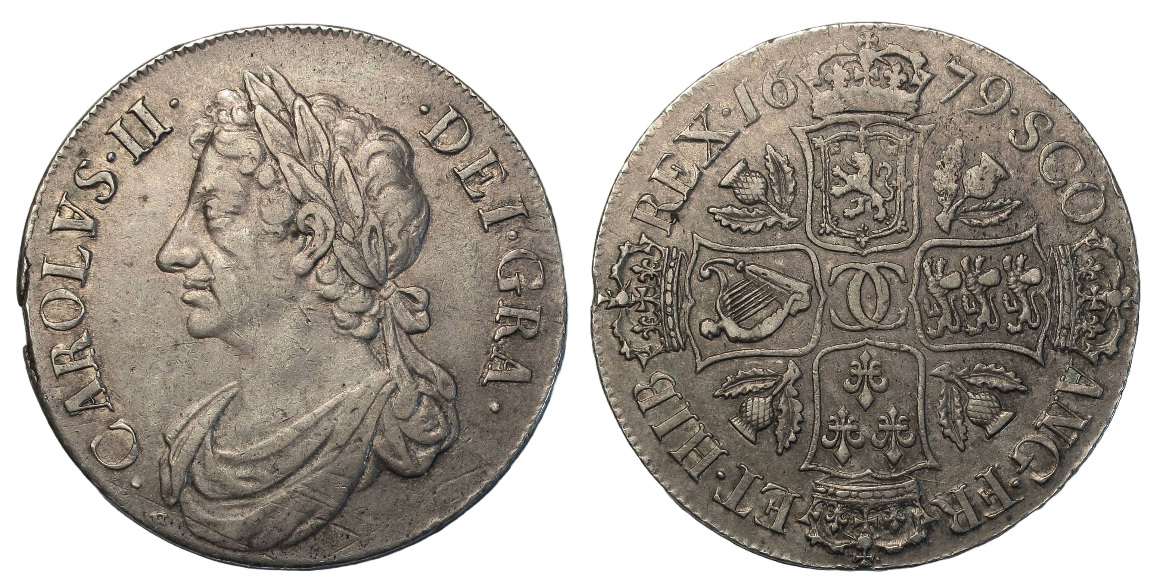 Dollar, 1679, second coinage, laureate and draped bust left, rev. crowned cruciform shields, thistles in angles, (SCBC 5618). Toned and good very fine