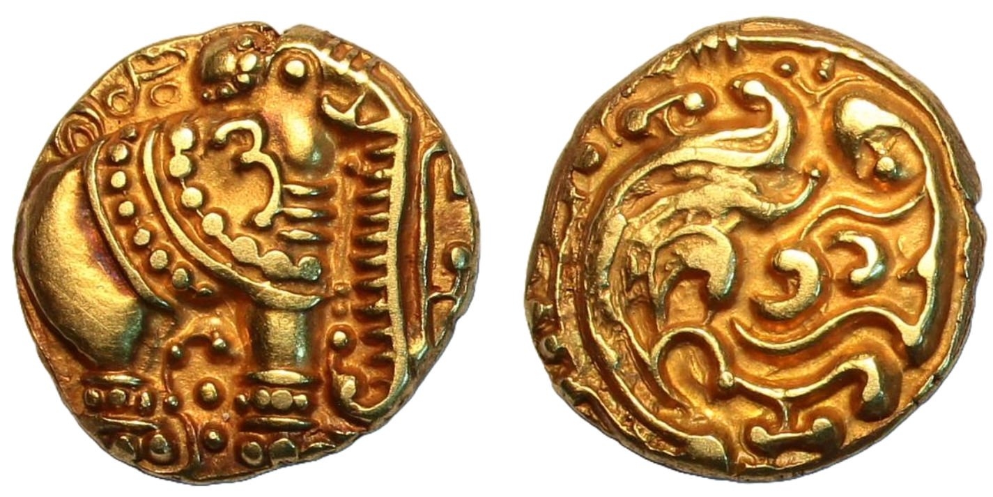 Gangas of Talakad, uncertain ruler (c. 1080-1138 AD), Pagoda, elephant standing right, Kannada letters to upper left, rev. floral scroll, 3.88g, (Friedberg 288, MNI 702). Reddish tone, extremely fine