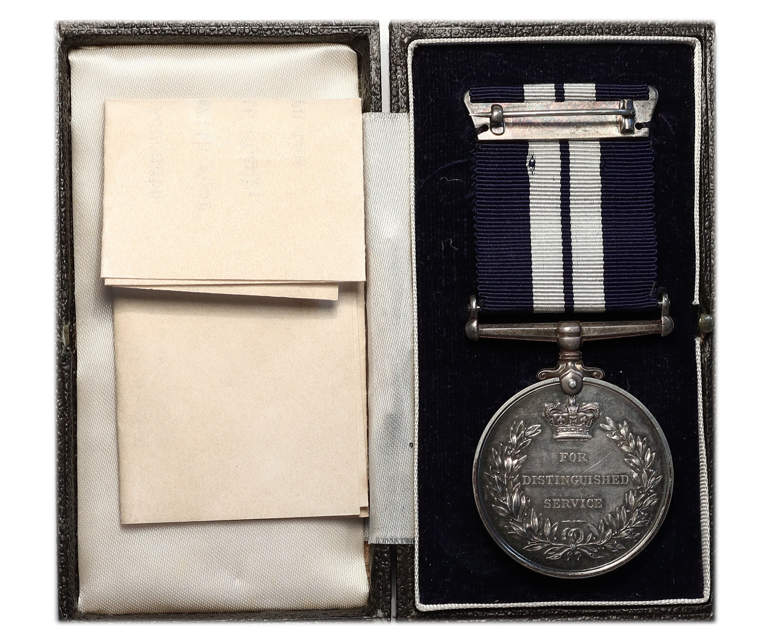 Distinguished Service Medal, G.VI.R. (C.E.R.A. R.A.Fisher. C/MX. 49885) impressed naming, mounted on original investiture pin, 1939-45 (held in original box with official letter); Star; Atlantic Star; Africa Star; Italy Star; War Medal 1939-45; Naval General Service 1915-62, 1 clasp: Minesweeping 1945-51 and Defence Medal together with additional items (see below)