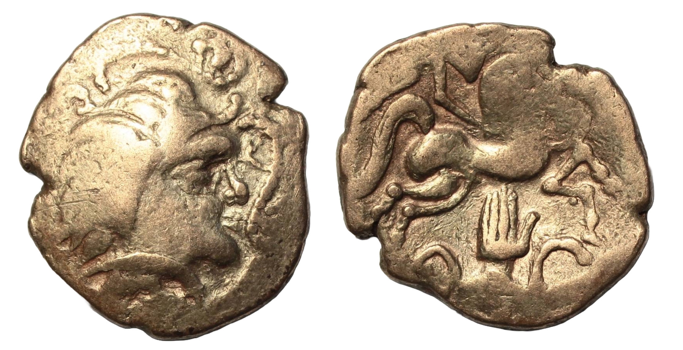 Pictones Stater, circa 1st century BC, pale gold, head right, hair in two rows of locks of which pearl cord extend, rev. helmeted human headed horse right, charioteer riding, hand below, 6.60g, (DT 3645-59 var). Good fine