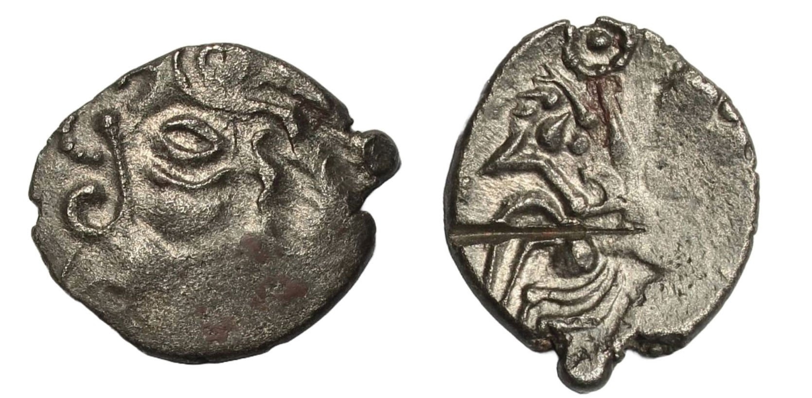 Abrincatui Quarter Stater, 1st century BC, billon, head right, rev. horse right, pole and circle on back, lyre below, 1.53g, (DT 2271 var). Much striking weakness obsuring design but identifiable nontheless, fair