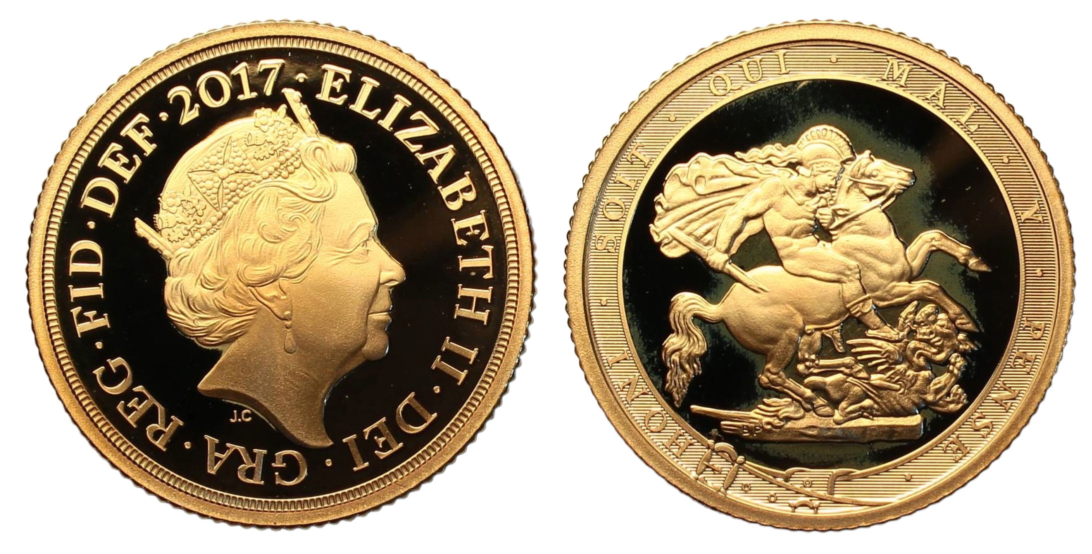 Proof Sovereign, 2017, 200th anniversary of the Benedetto Pistrucci Sovereign of 1817, crowned head right, rev. St. George slaying the dragon within garter, (SCBC SC11). Slight toning on reverse otherwise FDC, with Royal Mint box and certificate of authenticity