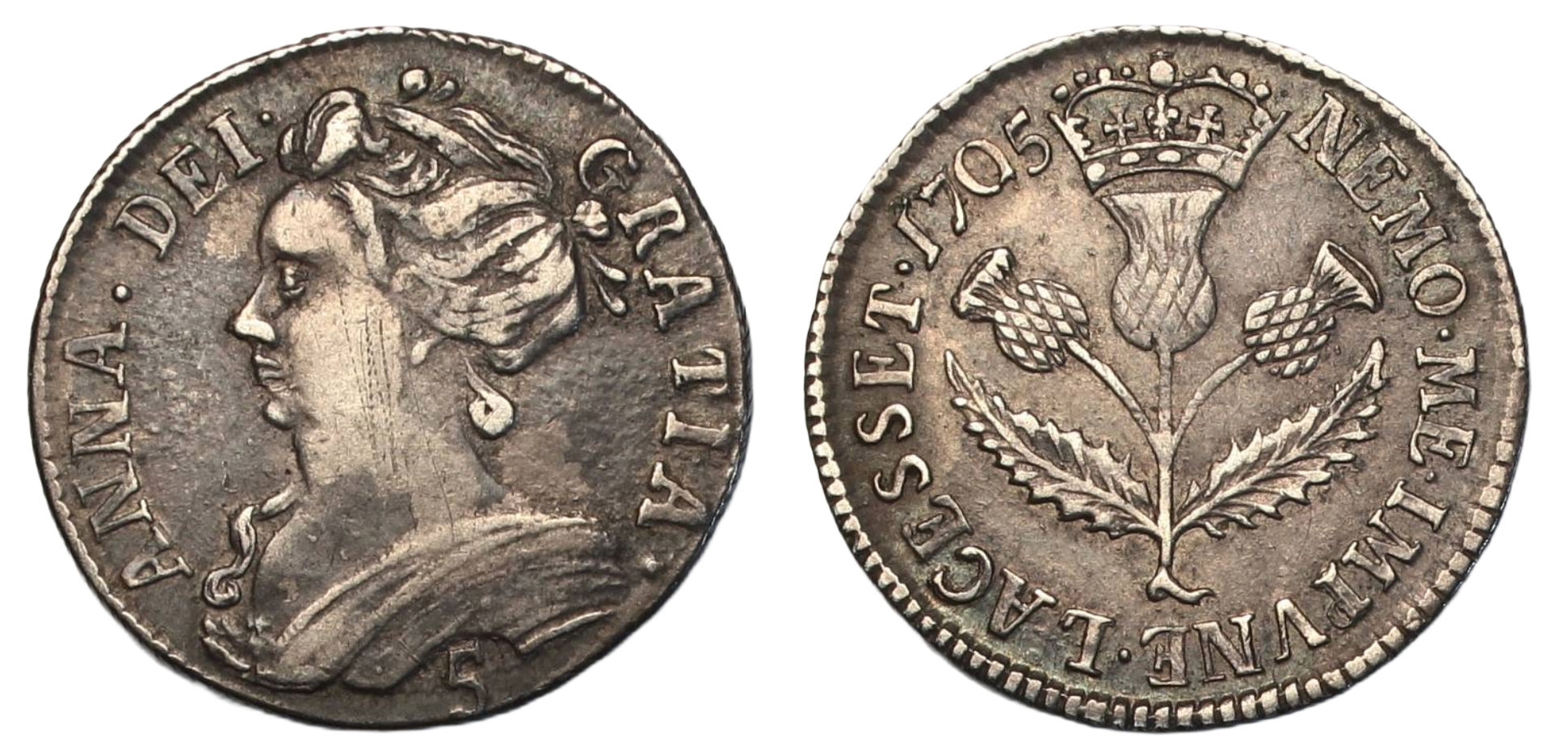 Five shillings, 1705, draped bust left, rev. crowned thistle, (SCBC 5702). Very fine