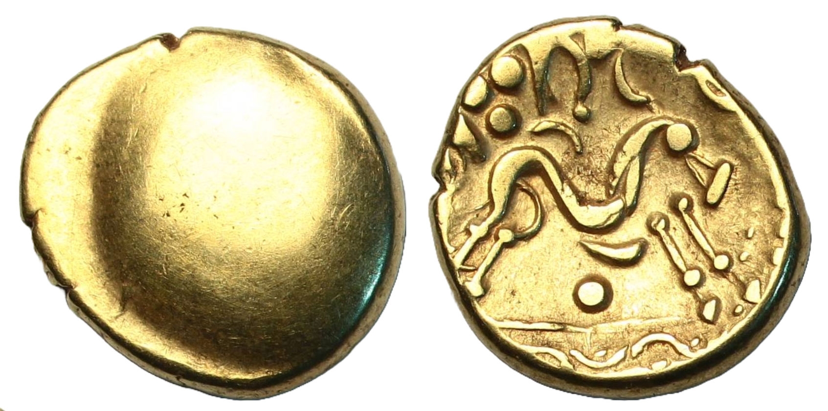 Stater, Ambiani (c.60-50 B.C.), series E, uniface, obv. plain, rev. sinuous horse right, various ornaments around and in exergue, 6.07g, (SCBC.11, ABC 16, Van Arsdell 52-01). Good very fine or better