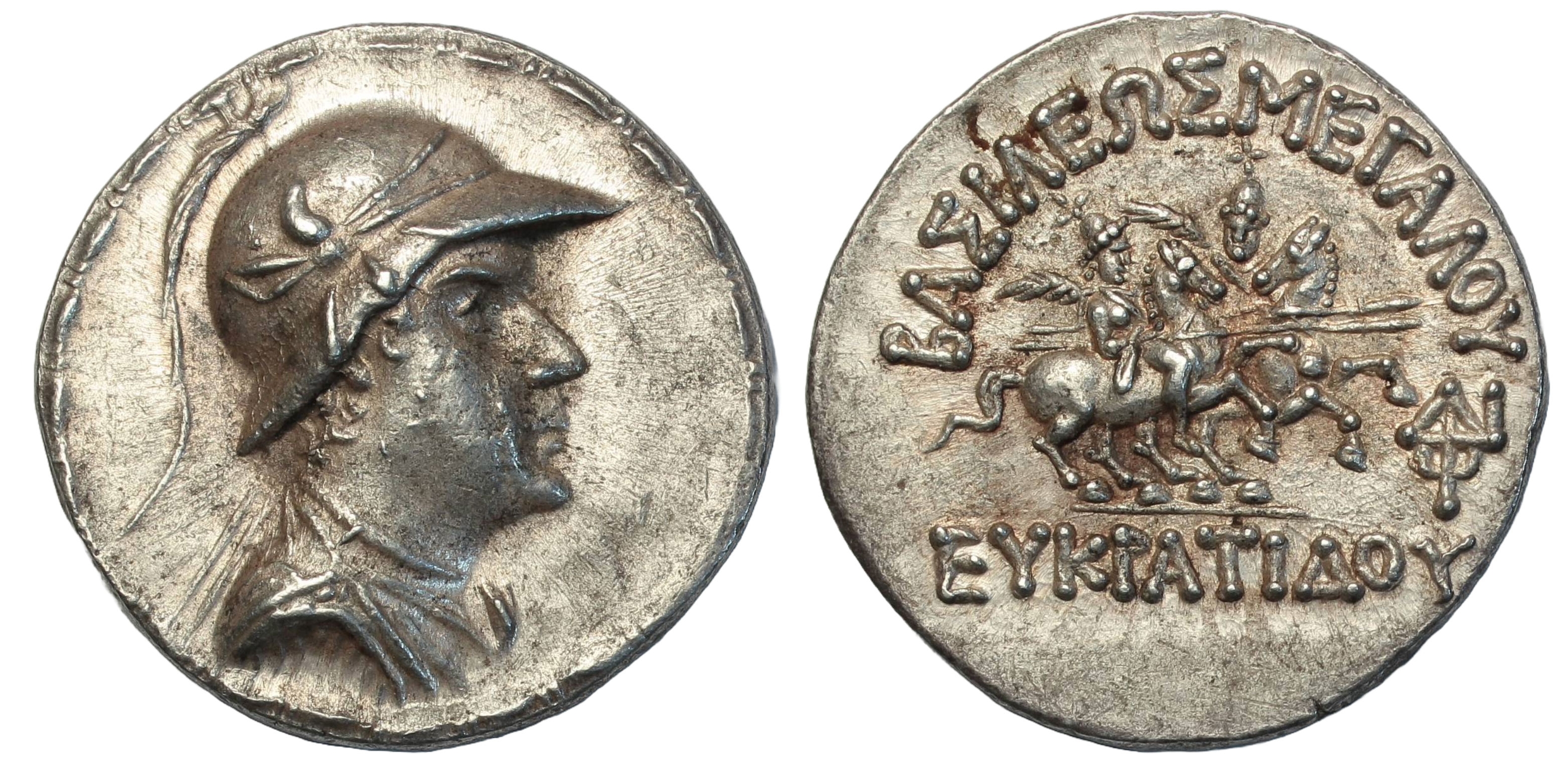 Eucratides I the Great (ca. 170-145 BC), AR tetradrachm, bust right wearing crested Bactrian helmet, bead-and-reel border, rev. ΒΑΣΙΛΕΩΣ ΜΕΓΑΛΟY ΕΥΚΡΑΤΙΔΟΥ, the Dioscuri on horses prancing right, ΔΝΨ monogram in lower right field, 16.99g, (Bopearachchi 6W, HGC 12, 131). Choice extremely fine