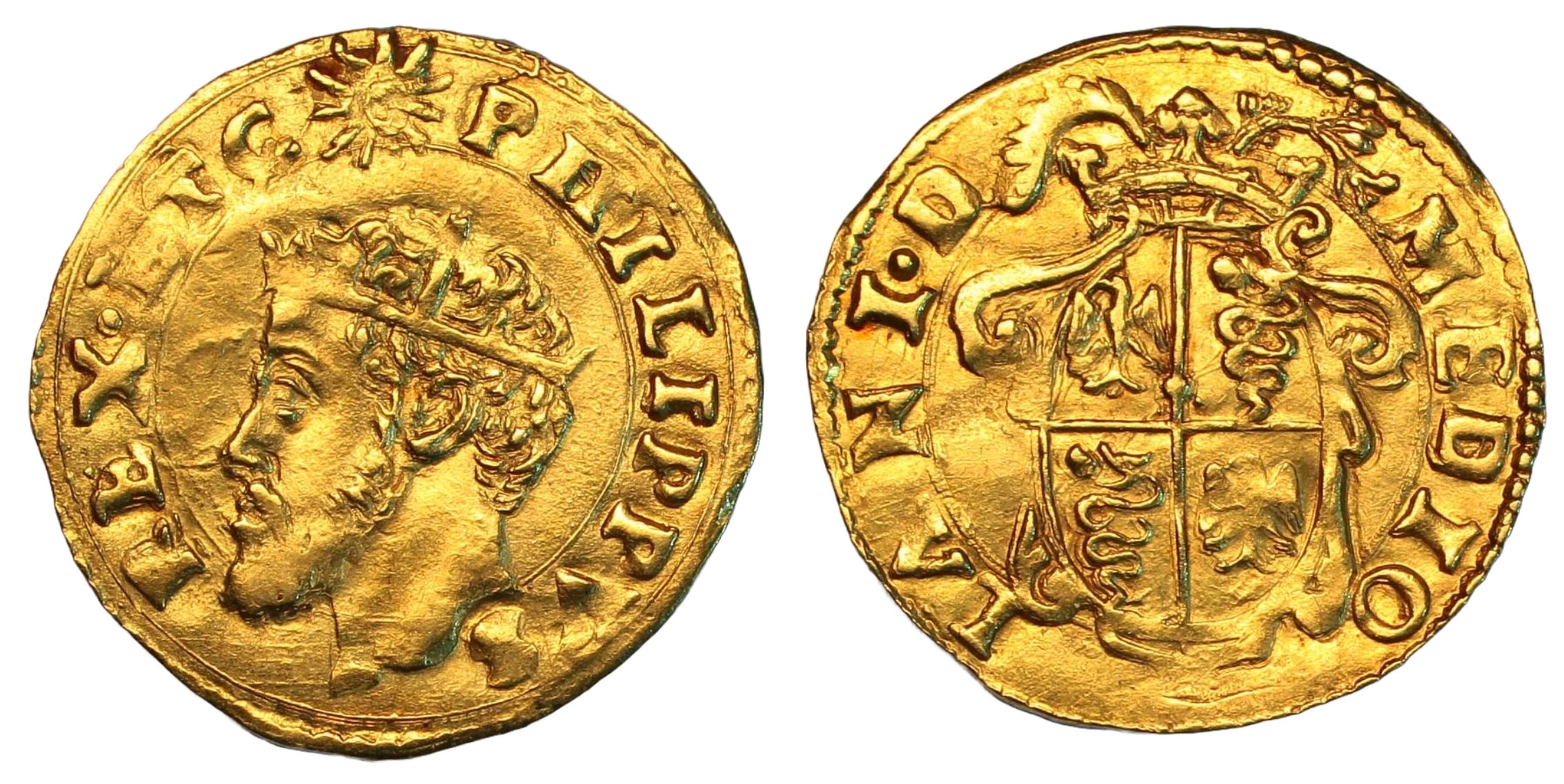 Scundo d'oro del sole, Milan, crowned head left, sun above, rev. crowned shield, 3.29g, (CNI 271, Crippa 7, Friedburg 718). Rarer type with the head breaking legend, weakly struck in parts but good very fine or better