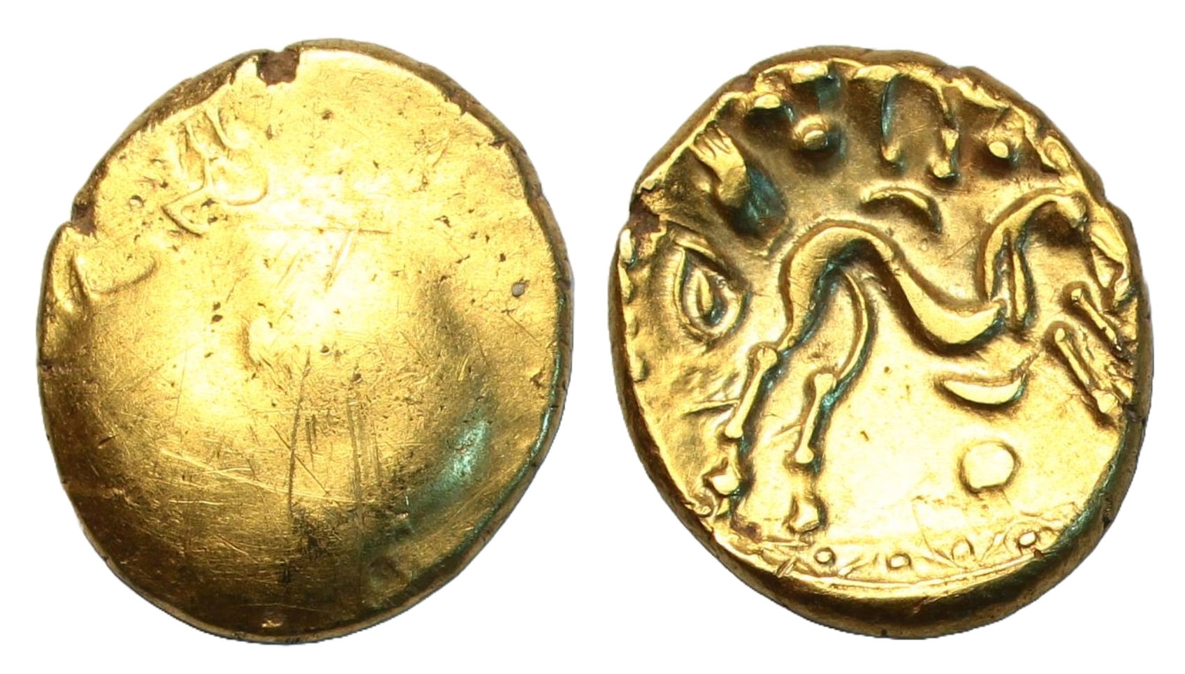 Stater, Ambiani (c.60-50 B.C.), series E, uniface, obv. plain, rev. sinuous horse right, various ornaments around and in exergue, 6.29g, (SCBC.11, ABC 16, Van Arsdell 50-01). Extremely fine with some detail to the periphery of the obverse