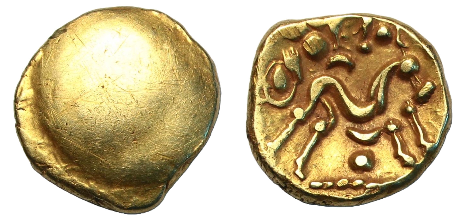 Stater, Ambiani (c.60-50 B.C.), series E, uniface, obv. plain, rev. sinuous horse right, various ornaments around and in exergue, exergue made up of pellets, 6.13g, (SCBC.11, ABC 16, Van Arsdell 52). Some light scratches on the obverse, otherwise good very fine