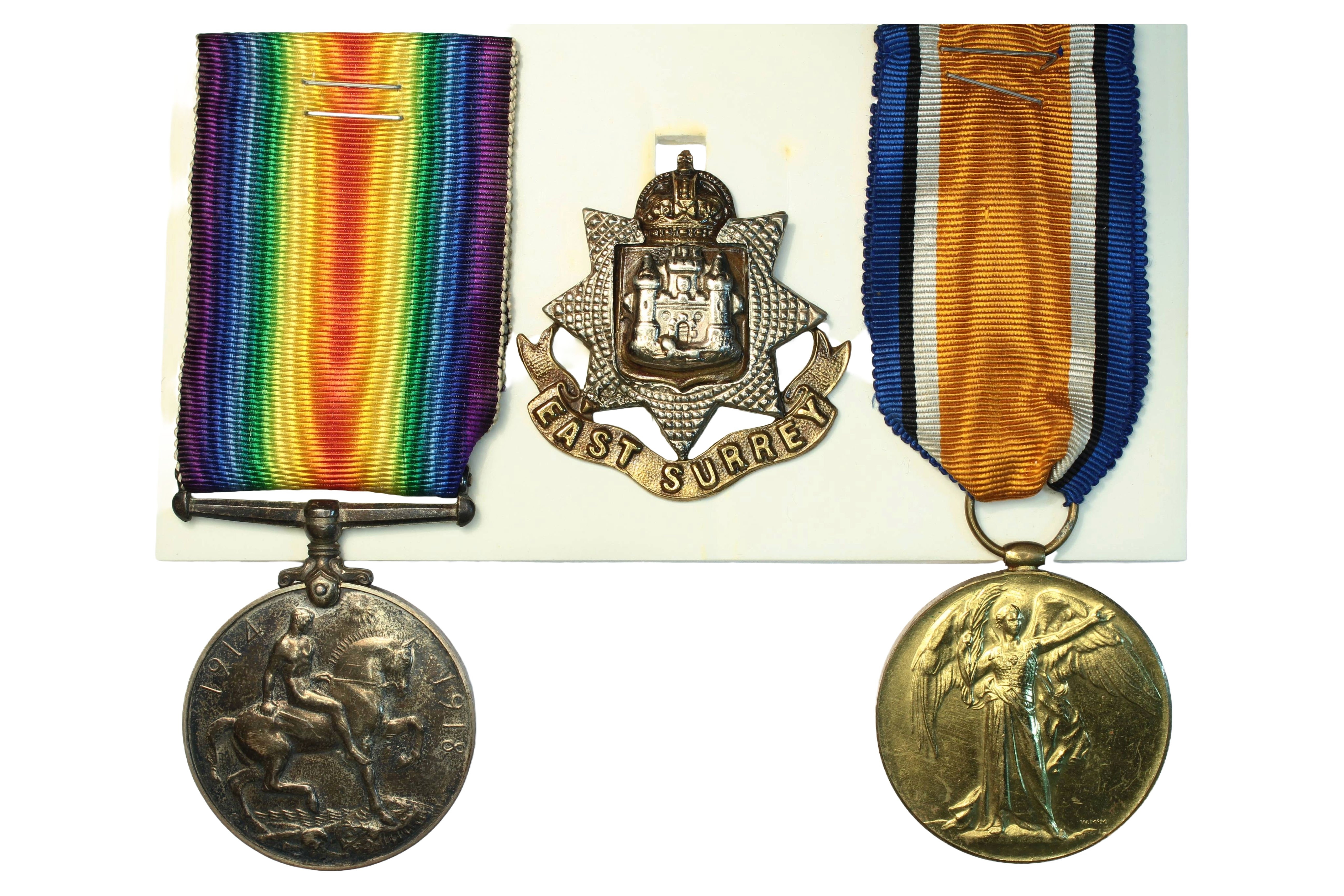 British War and Victory Medals, (20421 Pte.H.C.F.Frost E Surr.R.) with The Great War memorial plaque to Henry Charles Philip Frost and cap badge