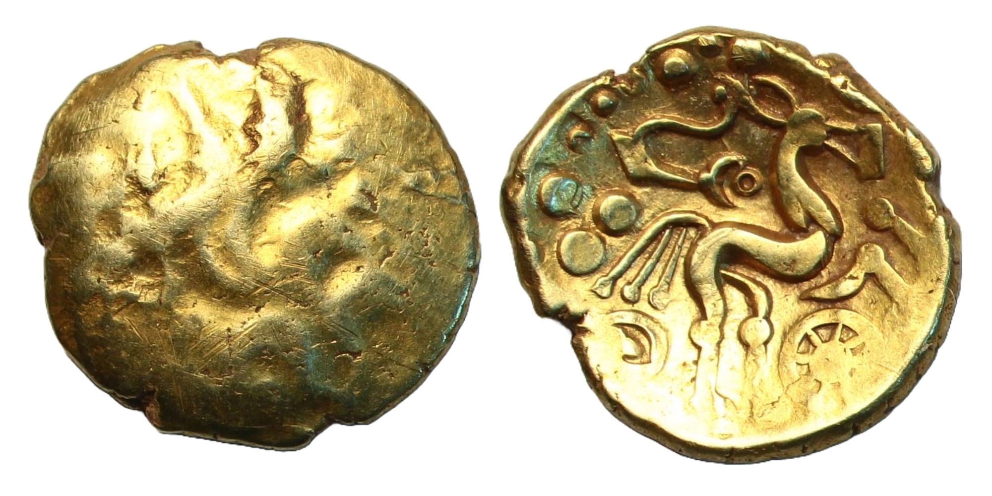 Suessiones Stater, possibly big eye type, wreath design, rev. triple tailed horse right, wheel below, charioteer's arms above with annulet, 5.96g, (SCBC 12, ABC 22). The annulet on reverse is normally found on the big eye type, although attribution is difficult due to wear on obverse, reverse very fine and rare