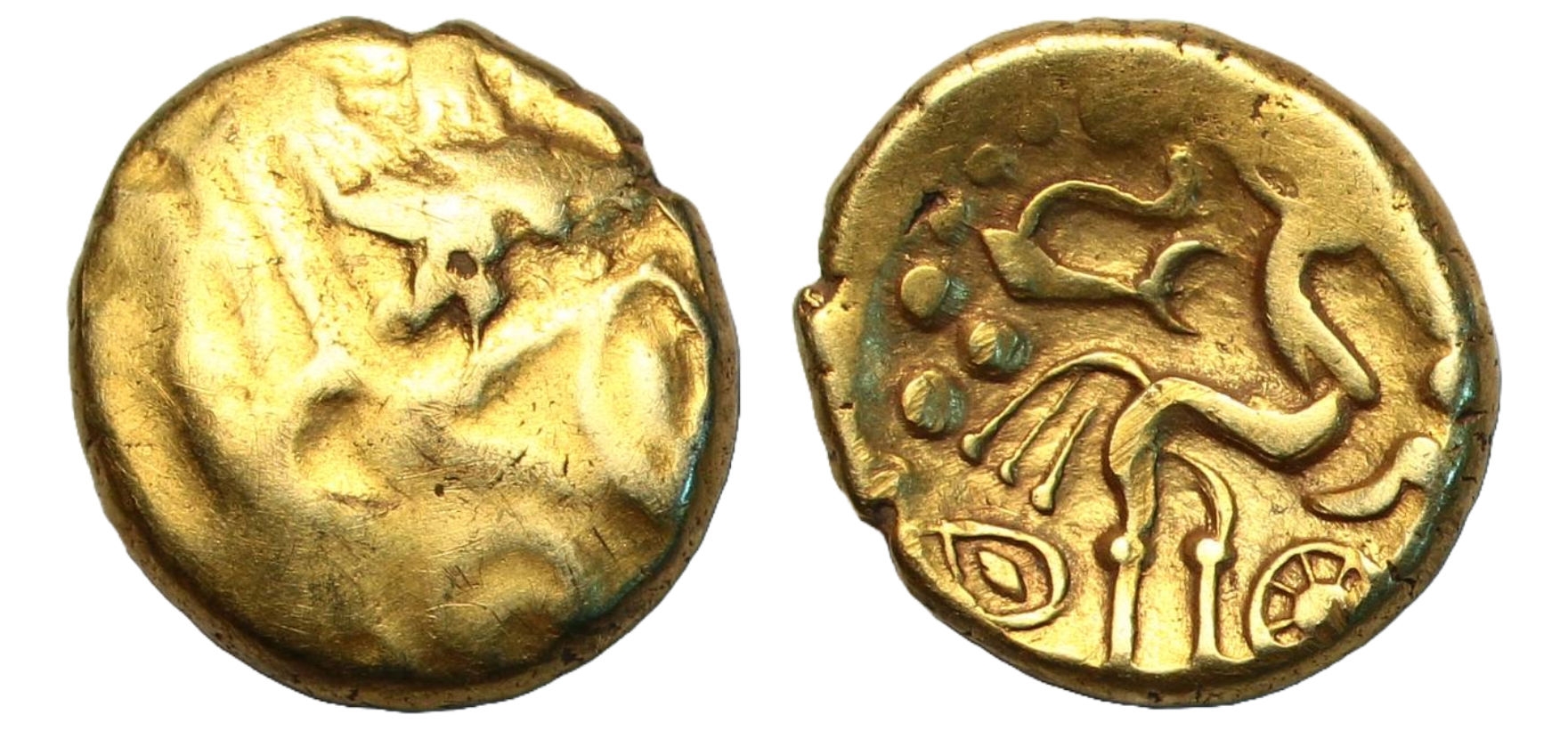 Suessiones Stater, big eye type, wreath, large eye formed by corded V, rev. triple tailed horse right, wheel below, charioteer's arms above, 6.02g, (SCBC 12, ABC 22, VA 85-01). Eye clearly visible although obverse weakly struck and worn, reverse nearly very fine, rare