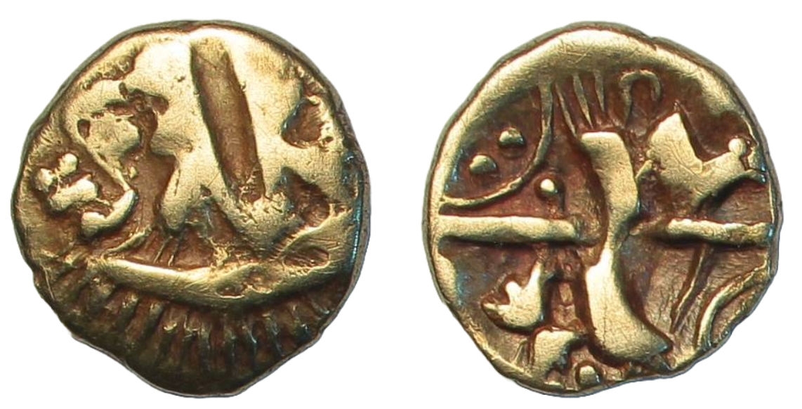 Quarter Stater, Hampshire thunderbolt, stylised boat with 2 standing figures, rev. cruciform thunderbolt motif, various objects in angles, 1.29g, (SCBC 46, ABC 767, VA 143). About very fine