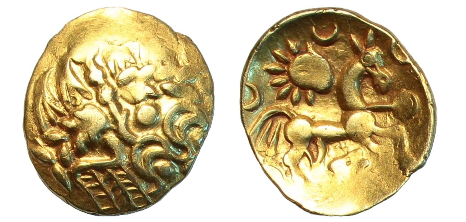 Quarter Stater, Bognor cogwheel, no mane type, wreath design with hidden face, rev. triple-tailed horse right, no mane, floral sun above, cogwheel below, 1.38g, (SCBC 48, ABC 512). Slight weakness but overall very fine, the obverse better, very rare