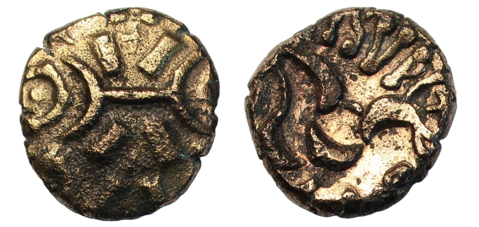 Stater, Esuprasu (c. AD 40-47), wreath crossed by bar with crescent at each end, ring of pellets in each crescent, rev. lunate horse left, star below tail, IISVP above (R in front, ASV below), 5.18g, (SCBC 405, ABC 1917, VA 920-01). Porous but legend visible and overall good fine